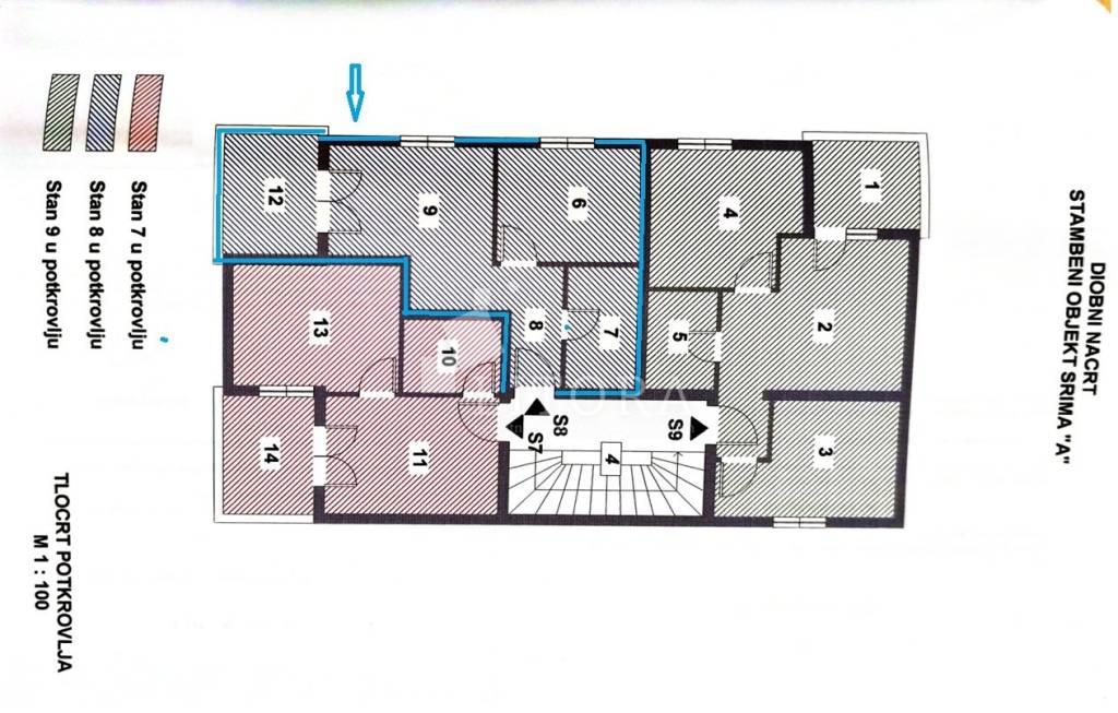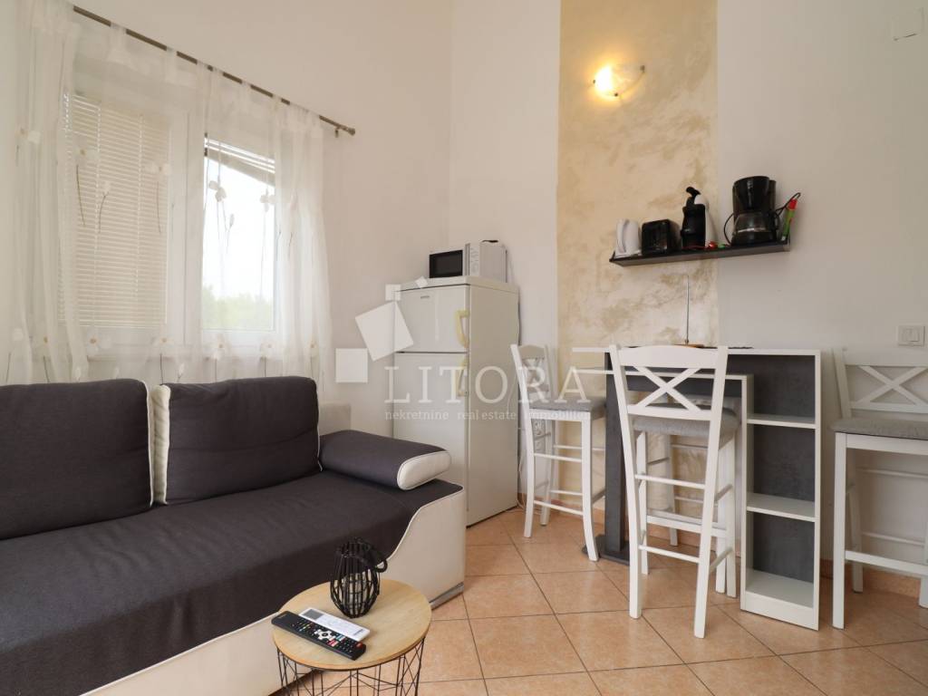 Srima – Fully furnished one-bedroom apartment with terrace. The apartment has a usable area of 32.93 m² and is located in a quiet part of Srima, in a multi-apartment building. It is situated in the high attic and consists of a hallway, bathroom, bedroom, kitchen with living room, and a terrace. The apartment includes one parking space in the building’s courtyard. It is oriented to the southwest. Equipped with air conditioning, it is sold fully furnished, with all furniture included in the price. Distance from the beach is 350 m and from the town center 300 m.