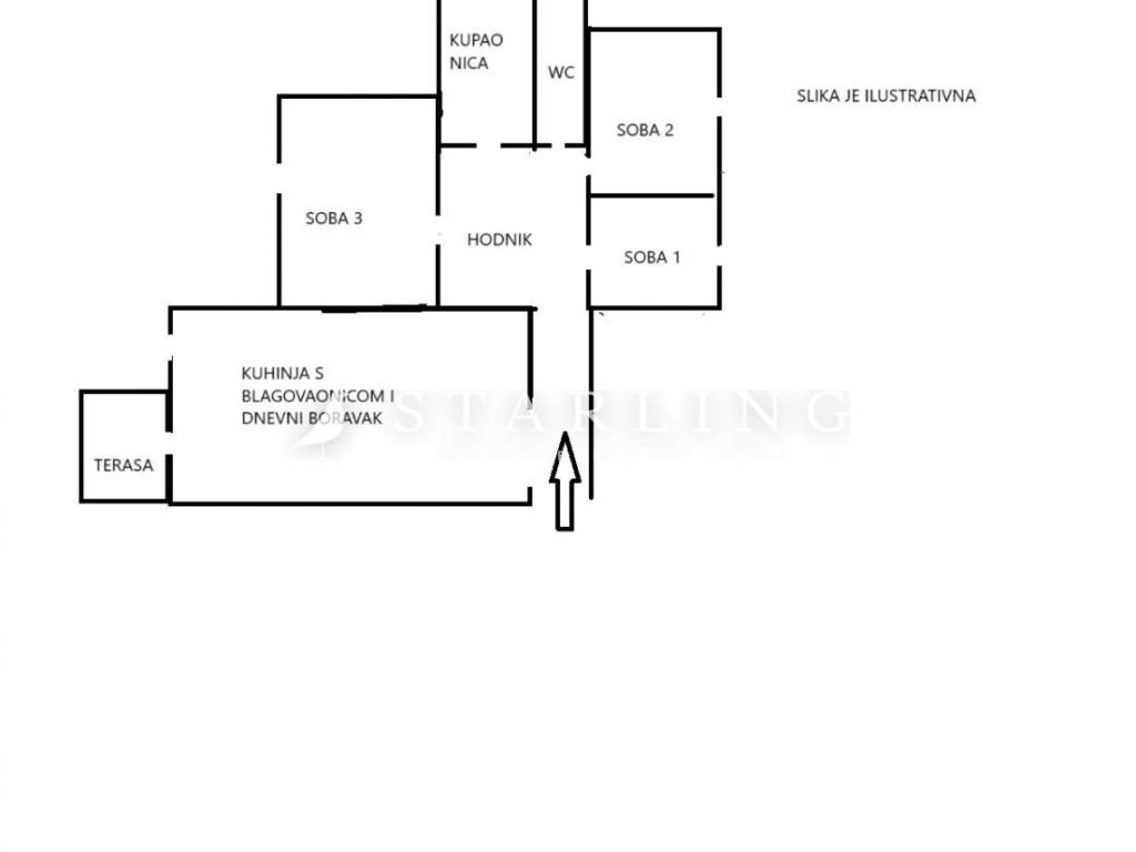 The apartment is 77 m2 in size and consists of an entrance area, kitchen with dining room, living room with access to a sunny terrace, three bedrooms, a modern bathroom, and a guest toilet.
