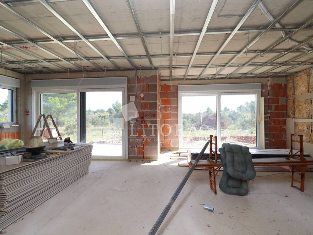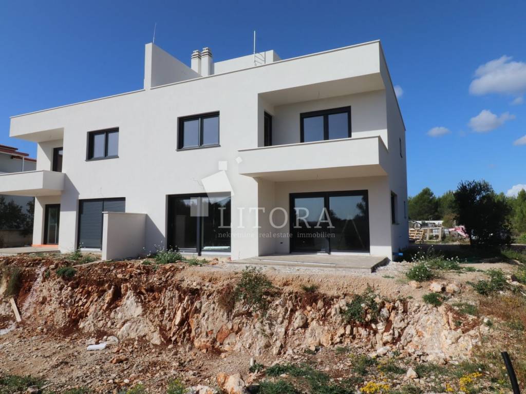 Srima – Family House with Roof Terrace, Swimming Pool and Garage, 550 m from the Pebble Beach. A modern semi-detached house in an attractive location in Srima, only 550 m from the pebble beach and 1,000 m from the town center. The property extends over three floors (ground floor + first floor + second floor) with a total living area of 204.40 m². It sits on a 250 m² plot featuring a spacious terrace and a swimming pool of 22.75 m². Ground floor: Garage, covered entrance, hallway, guest toilet, storage room, and a large open-plan living room with kitchen and dining area leading to a covered terrace with a pool and landscaped garden. First floor: Three bedrooms, two bathrooms, walk-in closet, hallway, and two terraces, one of which is covered. Second floor: Staircase and a large roof terrace with a surface of 92.15 m². The house is equipped with high-quality materials and modern amenities: security doors, aluminum joinery with electric shutters, underfloor heating throughout the house, air conditioning in every room, hot water boiler (200 l), and video surveillance installation. The garden is landscaped with Mediterranean plants, and the parking area is paved.