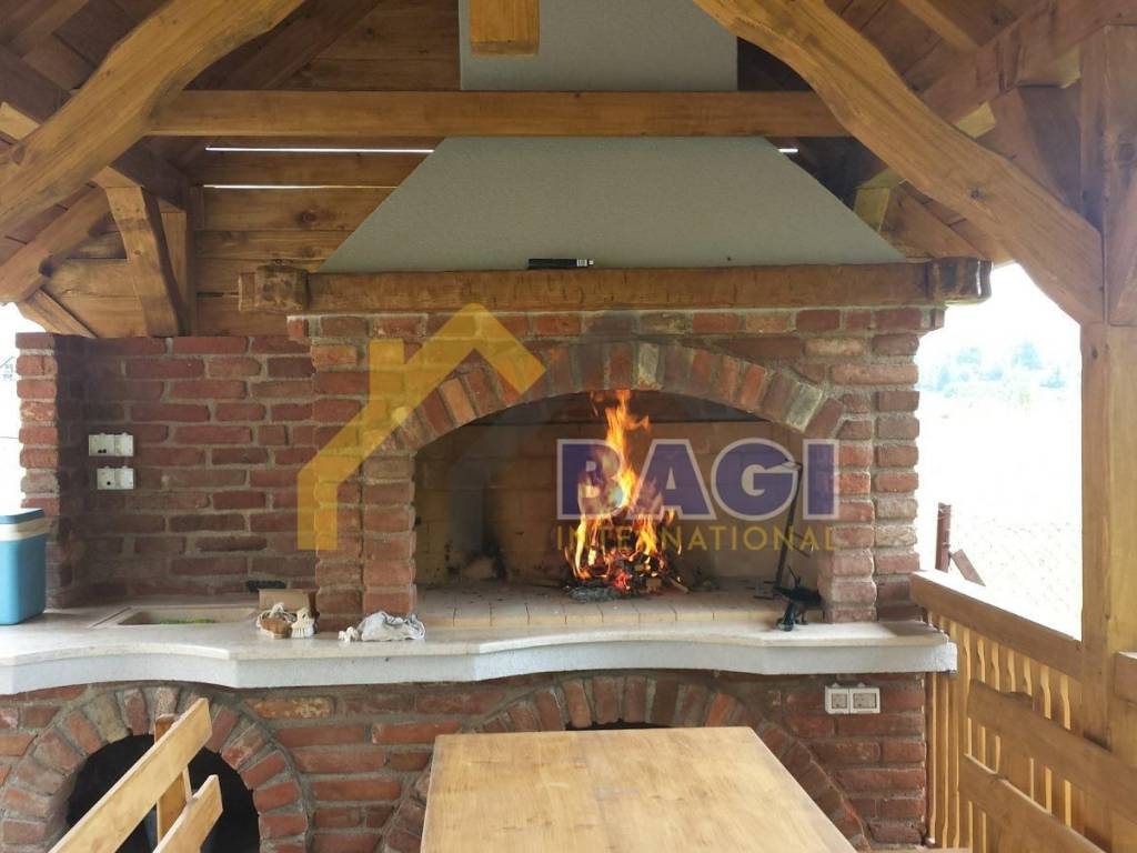 Gazebo with a brick fireplace, outdoor kitchen with sink, water, electricity and sockets, tables and benches.