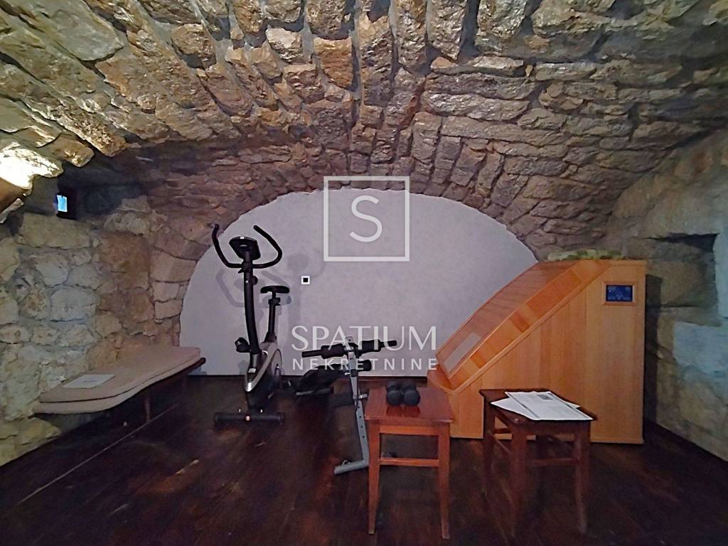 GRIŽANE, we were offered an autochthonous stone house in the hinterland with a surface area of 255.60 m2. It consists on the ground floor of a tavern that contains a spacious living room with a dining room, while on the other side of the building there is a separate entrance where there is an exercise area with a shower. Upstairs, in one part of the house, there is a separate bedroom with a bathroom, as well as in the other part, also with the same layout, with separate entrances. On the large garden there is a swimming pool and a wooden gazebo with seating. Due to the extensive plot, there is room for several parking spaces. The place is only a few kilometers away from the city and the sea. Due to its location and the specifics of the property, this is an opportunity for tourism as well as for a peaceful family life.