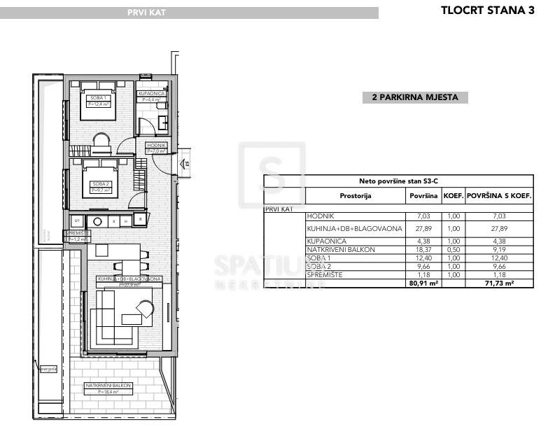 NJIVICE, ISLAND OF KRK, in an exclusive offer is a two-story apartment with a pool in a small new building. The area is 104.45 m2 and it is distributed as follows: kitchen with dining room and living room 38.55 m2, two bedrooms of 11.34 and 11.52 m2, two bathrooms of 5.48 and 4.78 m2, hallway 2.8 m2, storage room 0.84 m2, terrace of 66.10 m2, balcony 5.25 m2 and swimming pool of 11.30 m2. The apartment will be equipped with aluminum carpentry, first-class floor coverings and first-class sanitary facilities. Underfloor heating is installed via a heat pump, and a fan-coil system is used for cooling. Everything will be combined into a smart system, with which this innovative concept will improve the management of all devices and provide better system security and energy efficiency. In a quiet street, surrounded by family houses and luxurious new buildings, next to the green belt, this location offers everything you could wish for on vacation, as well as during a year-round stay. The planned completion of the works is August 2025. Experience a real summer vacation in the charming ambiance of a tourist resort right by the sea! Beautiful beaches, exceptionally blue sea, plenty of shade and a mild climate attract more and more guests to Njivice every year, which today are synonymous with family tourism. Once a small fishing village, Njivice is now a well-known tourist destination, a seaside place with a soul, which guests from European and other countries like to visit. For other information, please contact us with confidence. Azalea Kegalj Licensed agent +385 95 905 5464 azalea@spatium.hr Jana Hodak licensed agent 098/1671-888 jana@spatium.hr Spatium nekretnine +385 51 272 903 info@spatium.hr