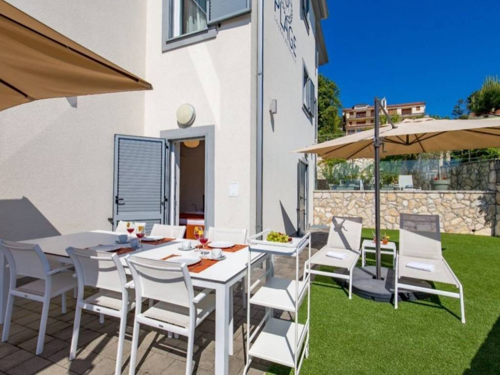 Lovran, prodaja ekskluzivnog apartmana površine 94,86 m2, u prizemlju luksuzne vile s pogledom na more i uređenom okućnicom od 96 m2. Apartman se sastoji od dvije spavaće sobe, dnevne sobe s kuhinjom i blagovaonom, kupaonice, toaleta, spremišta, hodnika i terase. Visoko kvalitetna gradnja i oprema, klimatizacija, zajednički unutarnji grijani bazen, parkirno mjesto. Mirna lokacija, 50 m od mora.