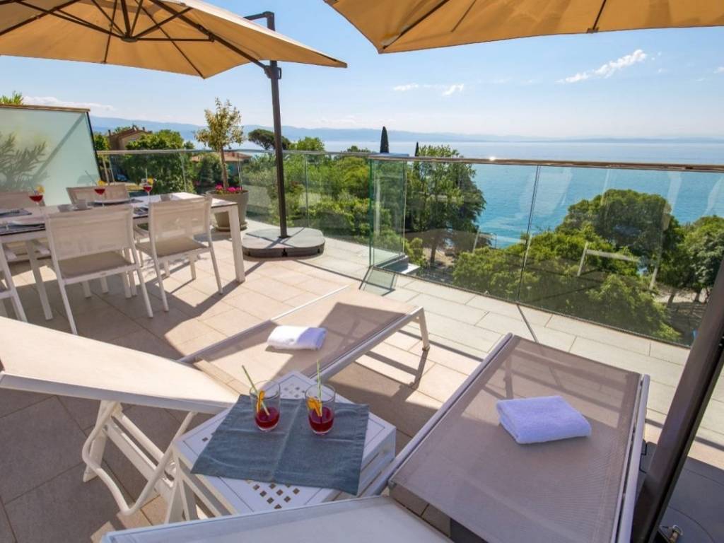 Lovran, prodaja luksuznog dvoetažnog apartmana površine 144,43 m2, s pogledom na more, 50 m od plaže. Apartman se sastoji od prvog kata s dnevnom sobom s kuhinjom i blagovaonom, spavaćom sobom, kupaonicom, toaletom i hodnikom te drugog kata s spavaćom sobom, radnom sobom, kupaonicom i terasom od 8 m2. Visoko kvalitetna gradnja i oprema, klimatizacija, zajednički unutarnji grijani bazen, parkirno mjesto. Mirna lokacija.