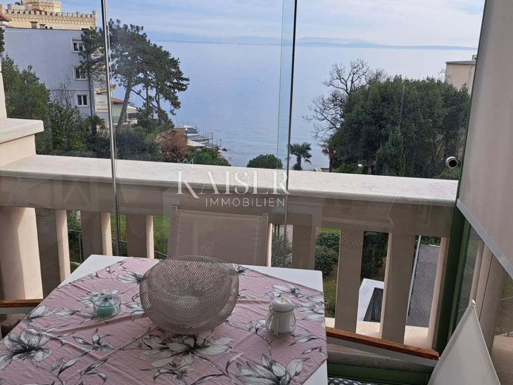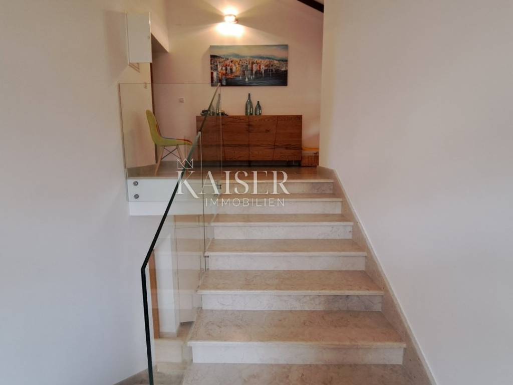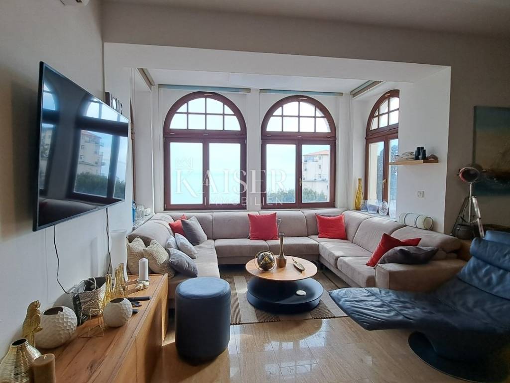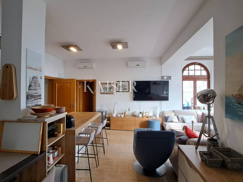 Kaiser immobilien presents you near the center of Opatija a luxurious two-story apartment in an Austro-Hungarian villa located about 40 meters from the beaches and the sea in the green oasis of the garden that surrounds it. The villa itself has been restored, the facade and roof have been completely renovated, with preserved original ornamentation. The property consists of a floor and a high attic, which is connected by an internal staircase. On the first floor there is an entrance hall, two bedrooms each with a bathroom and a toilet, a living room with a kitchen and an outdoor covered terrace, the rooms of which face the south side with a view of the sea and the coast. The staircase from the entrance hall leads us to a high attic where there are: two bedrooms with bathrooms and toilets, a kitchen with a living room and a terrace and a toilet on the mezzanine floor in a total area of 187 m2. On each floor there are 2 top quality air conditioners for cooling and heating. In the garden of the villa, right next to the apartment, there is a parking space on the roof of the tavern with a barbecue and an outdoor terrace with a view of the promenade along the sea and the beach. The furniture and the interior decoration itself is of top design in accordance with the space and the location where it is located. Larger cities are far from the location: Vienna 5 hours by car, Trieste 1 hour, Ljubljana 1 hour-30 minutes, Zagreb 1 hour-30 minutes, Pula airport 1 hour-20 minutes, Krk airport 40 minutes, Berlin 10 hours. For additional information and a tour, contact your agent: Eli Lovko, mob: 0916133776; eli@kaiser-immobilien.hr Agency commission is 3% + VAT