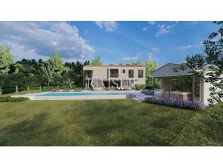 Kaiser Immobilien presents you a luxury designer villa, located on a hill in a quiet village near Motovun with a sea view. This modern building is located on a building plot of 1800m2 and the road leads to it only to that village. The house will be built in March 2023 and consists of 2 floors with a total area of 243 m2 and an auxiliary building of 60 m2. The ground floor of 164 m2 consists of a living room, dining room, kitchen, guest toilet, bathroom, storage room, wine cellar, garage, technical room and covered terrace. There are three spacious rooms with private bathrooms on the first floor. The auxiliary facility includes a sauna, a hydromassage pool for 6 people, a summer kitchen, a toilet, an outdoor shower and a storage room. The heated pool, with an area of 72m2, has overflow, massage and a shallow area for children. The heating and cooling system consists of a heat pump for underfloor heating throughout the house and auxiliary building and hot water preparation, as well as air conditioners in the suspended ceiling for cooling. There is also a prepared installation for photo voltage panels. The new customer has the possibility to join the project and make minor changes according to his wishes and needs. The start of construction is March 3, 2023. Furniture is not included in the price.