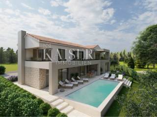 Kaiser Immobilien puts another beautiful new luxury villa with sea view on the market. The villa is located on the northwestern coast of Istria, more precisely near the town of Poreč. This beautiful villa is a part of untouched nature in a popular village where you can feel a touch of Istria and tradition. The villa was built with a ground floor and one floor, in a very modern style of construction and high-quality materials. The ground floor of the villa will have a hallway, toilet, laundry room, boiler room, living room with kitchen and dining room, bedroom, bathroom and covered terrace. On the first floor there will be a hallway, a study, three bedrooms and three bathrooms, one covered and one uncovered terrace. The heating will be electric underfloor and the house will be equipped with air conditioners. There will be a 49 m2 swimming pool on the plot. If you want this beautiful new villa to become your new home, contact your agent.