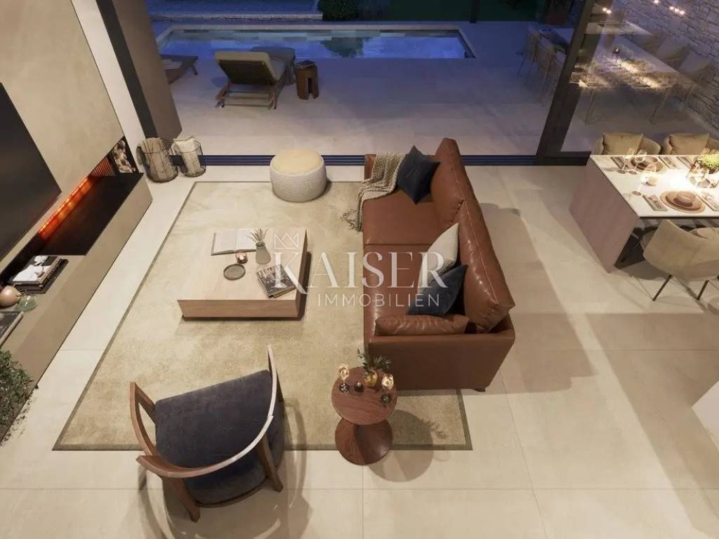 Kaiser Immobilien offers for sale a new modern, luxurious villa located just a few kilometers from the city of Poreč. Due to its exterior quality and interior comfort, the villa offers the highest level of living comfort and first-class amenities. The villa has a total of three spacious bedrooms, each with its own bathroom. This arrangement ensures privacy and comfort for all tenants. The villa is characterized by luxurious wellness. The private sauna offers the perfect opportunity for relaxation and regeneration. The interior is tastefully designed and invites you to escape from the stress of everyday life and settle down comfortably. The exterior of the villa is a paradise for those who want to relax. A saltwater pool is available for refreshing swim moments and offers a more natural alternative to conventional chlorine pools. In addition, there is a heated swimming pool that allows swimming in the colder months. The spacious terrace invites you to sunbathe and offers a picturesque view of the surrounding landscape. If you want this new luxury villa to become your new home, contact the Kaiser Immobilien agency.