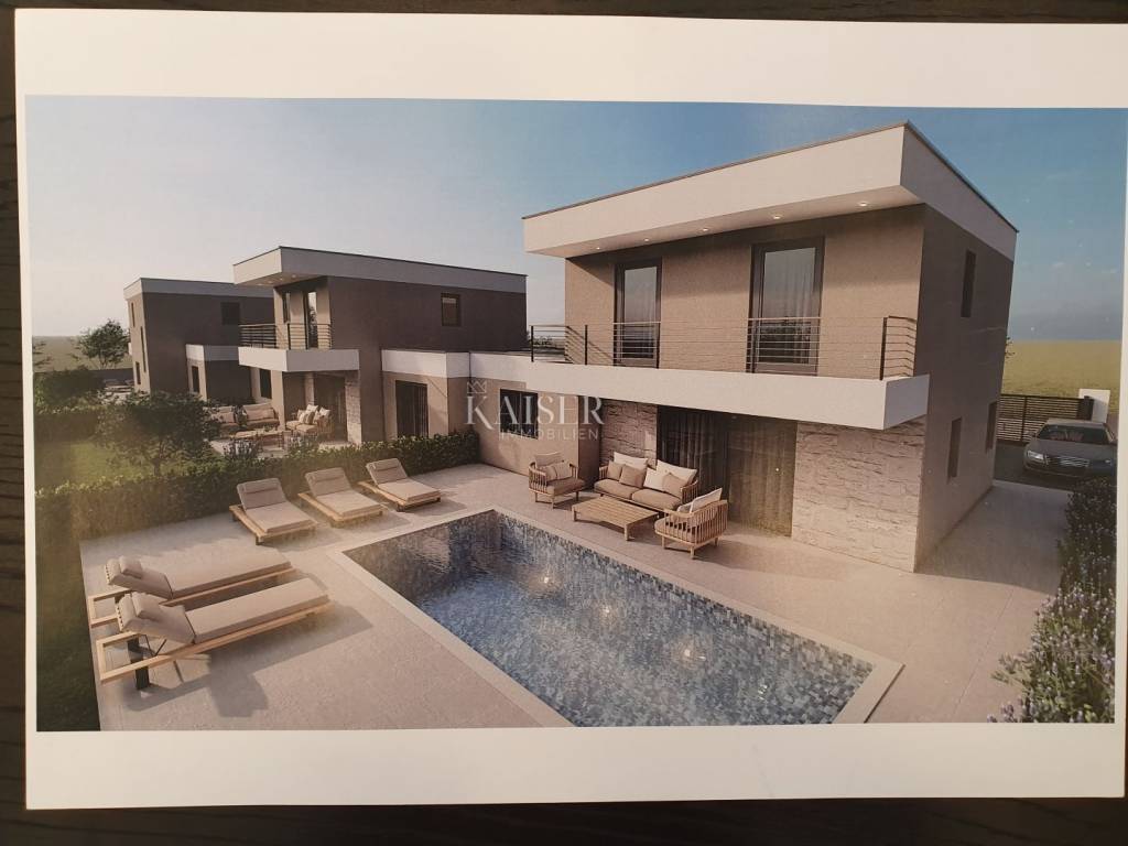 Kaiser Immobilien presents a brand new, modern house with a swimming pool, not far from the city of Poreč. The house is located only 4 km from the center of Poreč, and only 5 km from the sea. It is located in a very attractive location, both for the local population and for tourists. The basic and most necessary facilities for life are located near the settlement of the house, given the proximity of the city and other smaller settlements. Construction has already started on this house, and it is in the rowbau phase, and the planned completion of the house is at the end of the year at the latest. The house is located in a row of three identical units. Each house has its own swimming pool and its own private yard and parking for two cars. The building style of the house is a combination of modern and rustic style, with the addition of stone on the facade. The house is built with high-quality materials and excellent insulation, so attention is paid to every detail so that the future buyer is as satisfied as possible. The house consists of two floors. On the ground floor of the house there will be one bedroom, bathroom, kitchen and living room, dining room, pantry and engine room. Access to the pool is possible through the balcony door of the living room. The space on the ground floor is designed as an open space variant with lots of light and sunlight. On the first floor of the house there are two more bedrooms, one bathroom and a beautiful terrace with a view of the village and nature. The house will be heated by underfloor heating, but each room and living room also has an air conditioner. The yard is about 400 m2 in size, the pool is 24 m2 in size. The approach to the house is paved. By the end of the year, the city sewerage will be connected. Distance of the property to the city: Poreč - Pula Airport, 45 km Poreč - Ljubljana, 162 km Poreč - Vienna, 544 km Poreč - Prague, 868 km Poreč - Munich, 565 km If you want this modern and charming house to become your new home. , contact the agent at phone number 00385 923782803, or at the email address: ivana@kaiser-immobilien.hr. Agency commission is 3% + VAT.