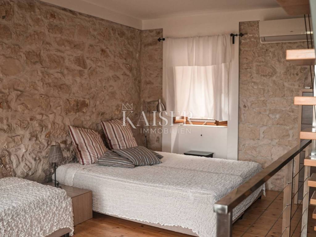 Kaiser Immobilien presents a beautiful authentic house on the island of Susak, Mali Lošinj. The floor area is 159 m2 on three floors, 57 m2 on the ground floor, 51 m2 on the first floor and 51 m2 on the second floor. The total living area of the house is 159 m2. The terrace on the ground floor of the house is 36 m2, and the terrace on the first floor is 28 m2, a total of 64 m2 of terraces. The house with two terraces overlooking the sea has a total area of 223 m2. The house is registered in the land register without any encumbrances. It was completely renovated in 2006 as a semi-detached house. Each with its own entrance and exit to the terrace. Each duplex consists of 79.5 m2 of living space and 32 m2 of terrace. The house has been regularly maintained and constantly renovated over the years. It is categorized for rental. During construction, cultural heritage conditions were taken into account. It was built of stone and brick, with stone frames for external doors and windows. The house has new foundations, a 14m3 reinforced concrete tank, reinforced concrete slabs on two floors with thermal insulation and a wooden deck. The ground floor has a kitchen with a dining room, a living room and a bathroom with a toilet. The floor is covered with quality ceramics. The roof is reinforced concrete with thermal insulation and a two-layer brick covering. On the 2nd. open floor up to 4m high, wooden beams with wooden cladding are visible. A new facade has been made, the joinery - windows, shutters and doors are made of Siberian larch. Quality mosquito nets have been installed on all windows. The interior of the house is a combination of natural stone, brick, wood and cement plaster painted white. On the 1st floor there is a walled terrace, open with a view of the sea, the floor is covered with tropical banghirai wood. Semi-detached house on three floors includes: - ground floor: 2x kitchen with dining room, 2x living room, 2x bathrooms with toilet, 2x modern wooden staircase with stainless steel railing, 2x exit to a fenced terrace made of indigenous stone with summer kitchens - electric grills, old brick concreted. on the first floor, 93 m2 (57 m2 house and 36 m2 terrace) - first floor: 2 triple rooms with access to the terrace and sea view, 79 m2 (house 51 m2 and terrace 28 m2) - 2nd floor: 2 triple rooms with sea view, 51 m2 - the wooden staircase is placed on a steel structure with a modern stainless steel railing The house is currently equipped for up to 12 people. Heating and cooling is arranged with a double inverter air conditioner, the house has a TV and internet connection. The water pressure booster is placed outside the house. Water is drained into a three-compartment septic tank located on the street. For any questions, please contact the agents: Davor Piškulić davor@kaiser-immobilien.hr +00 385 95 583 8240 WhatsApp, Viber
