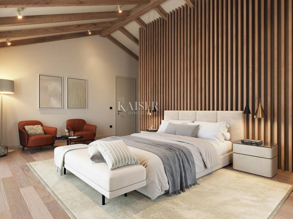 Kaiser Immobilien offers for sale a unique opportunity, a luxury villa adapted for people with disabilities. This unique and unique villa is a real rarity on the market, it is located only 4 km from the city of Poreč and the first beaches, and its design is adapted for people in need and yet in a modern, luxurious and unique way. The villa is completely detached, in the vicinity of which there are several smaller villas. It is located on the edge of nature, near which there will be no more construction. This fact alone is another great advantage because it is in the immediate vicinity of the green belt. The villa is distributed on the ground floor and first floor, with a very open, bright and luxurious appearance. On the ground floor of the villa there will be one bedroom, kitchen, dining room and living room, hallway, boiler room and guest toilet. On the first floor of the villa there will be 4 more bedrooms, 4 bathrooms and an entrance hall. There is a possibility to build another bedroom if necessary. The living space is organized in such a way that it is possible to move around the space in a "circle", which means that every element of equipment in the space can be reached from at least two sides. All passageways between equipment are dimensioned for unhindered passage with wheelchairs, so the minimum free space between equipment elements is 120 cm to 160 cm (passage dimensions and equipment dimensions are quoted). The ground floor and first floor are connected by stairs and a lifting platform measuring 150 x 130 cm. Sanitary facilities - bathrooms are organized so that there is enough space for wheelchairs to use the toilet, shower and sink. The rooms are large enough for unhindered movement of wheelchairs and access to the bed. Room number 2 has a 140 cm bed and a 100 cm wide bed. Room number 4 and number 5 can be family rooms that are separated from other rooms by a corridor (additional door in the corridor). On the upper floor, in the area in front of the stairs, it is also possible to place a smaller room 6, which in this example would have a shared bathroom with room 2 or possibly additional service areas. All vertical height differences and access to the pool will be equipped with ramps and the necessary handrails. All internal doors are 90 cm wide. The beach around the pool is more than big enough. There are 3 parking spaces under the parking lot canopy, and an outside storage room is provided next to the canopy. The building is designed so that it is in harmony with the buildings that are or will be in the immediate vicinity. The size of the plot is 978 m2, the floor plan gross floor area is 170 m2 and the pool 35 m2 (dimensions 10 x 3.5 m). Distance of the property to the city: Poreč - Pula Airport, 45 km Poreč - Ljubljana, 162 km Poreč - Vienna, 544 km Poreč - Prague, 868 km Poreč - Munich, 565 km If you are looking for this kind of property, contact us with confidence at phone number 00385 923782803, or to the email address: ivana@kaiser-immobilien.hr. Agency commission is 3% + VAT.
