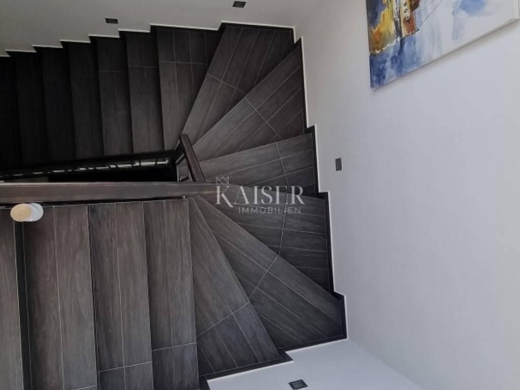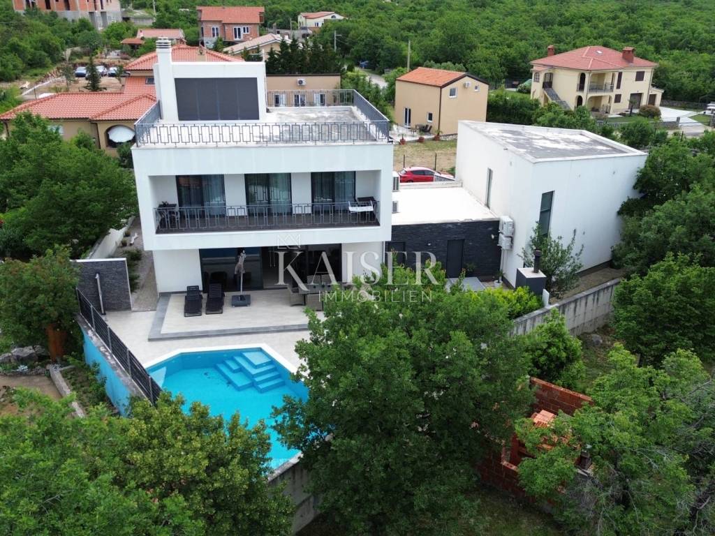 Kaiser Immobilien presents a modern luxury villa in Šmrika, not far from Rijeka and Crikvenica, with a unique view of the island of Krk and the entire Kvarner Bay. The villa is located in an exceptionally quiet part of the town, and at the same time close to all traffic routes. It consists of two residential units connected by a garage, making up a total of 400 m2 of space. The larger building extends through the ground floor, which consists of a large open-plan living area consisting of a modern functional kitchen equipped with quality Bosch appliances, a dining room and a living room from which you can exit to the outdoor terrace with a swimming pool through a large darkened sliding wall, giving the impression of a connected indoor and outdoor space. The living room also has an elegant wood-burning fireplace. There is also a storage room, laundry room and toilet on the ground floor. An elegant staircase leads to the first floor where there is a large bathroom with a bathtub, 3 bedrooms, one of which has its own bathroom and access to a balcony, and the other two have access to a balcony. All rooms have Smart TV and air conditioning. The staircase leads to a small gym and a large roof terrace, an intimate sunbathing area that offers an exceptional view of the island of Krk, the island of Cres in the distance, Učka and the entire Kvarner, and on the other side of the hinterland. A large covered terrace with a swimming pool and sunbathing area, an outdoor shower and a small kitchenette with a barbecue further refine this part of the house and create an idyllic space for socializing and relaxing. The second, smaller residential unit on the ground floor has a modern equipped kitchen, a living room and dining room with access to a small private terrace, and a bathroom. A bright staircase leads to the first floor, where there is a bathroom, a children's room and two bedrooms with access to a balcony. All rooms have a Smart TV and air conditioning. Every corner of this villa is furnished elegantly and functionally, yet comfortably and warmly, and every part of the space is used to its full potential. These two buildings are connected by a garage that can accommodate two vehicles, the garage has a water and electricity connection, so that electric cars can also be powered by electricity, which is very practical nowadays. The villa is completely fenced, has video surveillance, ready-made underfloor heating, a wood-burning fireplace, and is also equipped with Mramoterm panels for heating the entire space. It is equipped with quality aluminum joinery and electric shutters. The outdoor area is decorated in a Mediterranean style, maintained and pleasant, adapted to the conditions of the coastal region. This property is used for tourist purposes, but it also has the possibility of living in one part and renting out the other. Sea, beach: 220 m Crikvenica: 15 km Rijeka: 20 km Rijeka Airport: 7.5 km Zagreb Airport: 162 km Ljubljana: 130 km Munich, Vienna: 530 km The agency commission for the buyer is 3% + VAT, and is paid only when selling the property, when signing the first legal act. For all further information, please contact: Marijana Cuculić Phone: + 385 98 186 9950 WhatsApp, Viber E-mail: marijana.cuculic@kaiser-immobilien.hr Davor Piškulić davor@kaiser-immobilien.hr +00 385 95 583 8240 WhatsApp, Viber