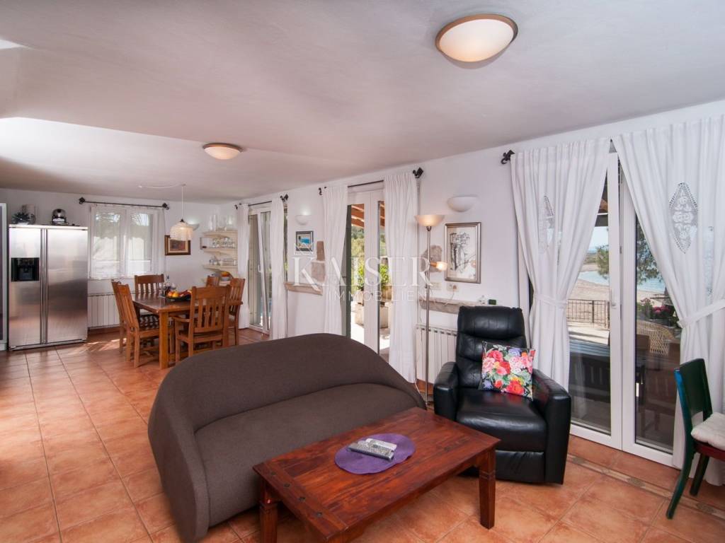 Kaiser immobilien is mediating the sale of a villa with a swimming pool in an exceptional location in Supetar on the island of Brač - first row to the sea. The villa with a total living area of 210m2 is spread over three floors. On the ground floor there is an open-concept living area that includes a living room, kitchen and dining room, as well as a bathroom with a bathtub and a guest toilet. The living area leads to a covered terrace, an ideal space for socializing and enjoying long summer evenings. An internal staircase leads to the first floor where there are two bedrooms with their own en-suite bathrooms and a beautiful view of the sea and the unique Mediterranean environment. A special feature of this property is the basement, which is glazed enough to allow daylight to make this space pleasant, and consists of a living room, wine cellar and engine room. On the landscaped plot there is a 25m2 swimming pool, a sunbathing area and a shower, and a Mediterranean garden - an ideal space for relaxing and enjoying the sounds and smells of the sea and pine trees. Exceptional location, only 10m from the sea and beach, excellent layout, quality construction and Mediterranean surroundings are just some of the benefits that make this property an ideal choice. The agency commission for the buyer is 3% + VAT and is paid in the case of purchasing a property, upon conclusion of the first legal act. ID CODE 105-299