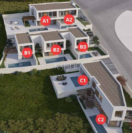 Crikvenica is a charming coastal town located on the Kvarner Riviera, known for its long pebble beaches, crystal clear sea and mild Mediterranean climate. In addition to its rich tourist offer, Crikvenica offers numerous restaurants, seaside promenades, cultural events and excellent transport connections with the rest of Croatia and abroad. It is an ideal destination for a family vacation, but also an attractive location for investing in real estate. Kaiser Immobilien presents you with an exclusive project in Crikvenica - seven modernly designed houses located in an elevated and quiet location that provides an unobstructed panoramic view of the sea and the city, thanks to the immediate proximity of the green belt where construction is not allowed. Surrounded by Mediterranean nature, these properties offer the perfect combination of privacy, natural beauty and quick access to promenades, beaches and numerous catering and recreational facilities. One of the houses within the project extends over two floors and has a total area of 69.50 m², while it also has a private garden of 129 m² and a swimming pool. The ground floor includes a spacious living room, dining room and open-concept kitchen of 31.50 m², as well as a guest toilet of 2.50 m². The living room leads directly to a covered terrace of 14 m², where there is a private swimming pool and a landscaped garden, ideal for enjoying the Mediterranean ambiance. An internal staircase leads to the first floor where there are two spacious bedrooms, a bathroom with shower and toilet of 4.60 m². Both bedrooms have access to a covered terrace of 12.60 m2, with a stunning view of the sea. The interior has been designed with special attention to comfort and aesthetics - the rooms are filled with natural light thanks to large glass surfaces that connect the interior with the exterior. High-quality materials such as aluminum joinery and vinyl flooring (LVT or SPC) have been used, while underfloor heating is provided in all rooms, with the additional comfort of air conditioning in each room. During the construction phase, buyers have the option of personalizing the interior through the selection of ceramics and finishing materials, and with prior agreement and additional payment, additional changes to the layout or content are possible. Each residential unit has one secure parking space, and there is a possibility that parking spaces will be added during construction. The special value of this project lies in its position - the sea view will not be disturbed by future development of the surrounding area, which additionally ensures the lasting value of the investment. The property is being sold unfurnished, and the completion of the project is expected by the end of 2026. This is an ideal choice for those looking for a luxurious and peaceful oasis on the Adriatic, both for private use and for investment in the most touristically attractive part of Crikvenica. Proximity to amenities: Crikvenica, center - 1 km Restaurant - 1 km Cafe - 900 m Shop - 1 km Sea/beach - 1.1 km Marina - 1 km Pharmacy - 1.1 km Bus station - 1.1 km Attractions - 900 m Rijeka - 32 km Airport - 23 km Distance to major cities: Crikvenica - Ljubljana: 147 km Crikvenica - Vienna: 519 km Crikvenica - Budapest: 508 km Crikvenica - Prague: 846 km Crikvenica - Munich: 548 km Crikvenica - Zagreb: 167 km The agency commission for the buyer is 3% + VAT and is paid in the case of purchasing a property, upon conclusion of the first legal act. Interested buyers can view only after previously signing a real estate brokerage contract. ID-CODE: 127-151 If you would like to visit the property in person, please contact: Jennifer Hofmann E-mail: jennifer@kaiser-immobilien.hr Tel: +385-91-515-0887 http://kaiser-immobilien.hr/ Or Davor Piškulić E-mail: davor@kaiser-immobilien.hr Tel: + 385 95 583 8240 WhatsApp, Viber