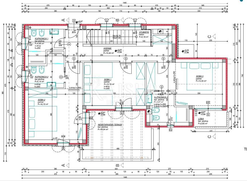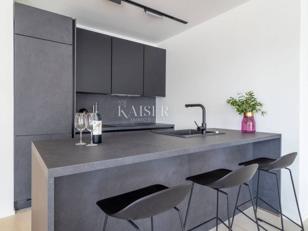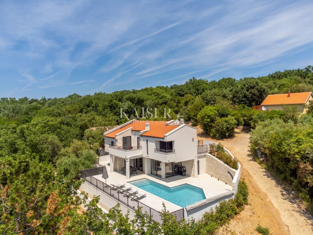 Kaiser immobilien offers an exclusive secluded villa, only 400 m from a beautiful sandy beach in the vicinity of Vrbnik. The house has a total area of 150 m2. On the ground floor there is a sunny living area of 45 m2 with a living room, dining room and kitchen, as well as a guest toilet, storage room and engine room. There are three bedrooms and three bathrooms on the first floor, which is connected to the ground floor by internal oak-lined stairs. Each room has an exit to the terraces, from which there is a beautiful view of the sea and the greenery that surrounds this beauty. The living room leads to a covered terrace of 30 m2. There is a spacious heated swimming pool of 40 m2 surrounded by a 200 m2 sunbathing area with a gas grill. It is a place where you can enjoy socializing or simply relaxing with the benefits of the Mediterranean climate and the smell of the sea. The garden area is elegantly divided by well-kept gardens dominated by Mediterranean plants and olive trees. This unique villa boasts high-quality construction, modern and high-quality floor coverings and sanitary ware, air-conditioned rooms, underfloor heating on the first floor, preparation for an outdoor and indoor fireplace, aluminum carpentry and security doors, as well as modern and designer furniture, and is sold furnished. This beauty is a real opportunity for those who want to rest in a quiet and gentle corner of the Mediterranean, but also for those who want to engage in tourism. Sandy beach: 400 m Shop: 900 m Airport: 20 km Restaurants: 8 km
