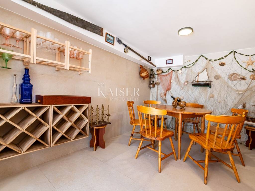 Kaiser immobilien mediates the sale of this beautiful villa with a swimming pool in Novigrad near Zadar. The villa is only 70 m from the sea, and offers a beautiful view of the sea and the sunset. The villa is decorated outside and inside in the traditional Mediterranean style of stone construction, combined with modern luxury. Stone from Brac was used in the construction of the facade, and every detail in the interior of the villa stylistically fits into the ambience of the Mediterranean and Dalmatia. The total living area is 250 m2, and the villa is built on a spacious plot of 1037 m2, which also includes a tennis court. On the first floor there is a living room with a fireplace, a kitchen and a dining room, and a wellness room with a Finnish sauna. The sauna leads to the terrace where there is a jacuzzi and a wood-burning grill. There are also two bedrooms and two bathrooms. On the second floor there are two more bedrooms with attached bathrooms. All rooms are air-conditioned, and underfloor heating is provided through the living room and all bathrooms. On the ground floor there is a wine cellar, a children's playroom and a gym. The ground floor leads to a spacious terrace with a summer kitchen, an outdoor dining table, and a place to relax. In the completely fenced yard there is a heated pool of 32 m2, from which you can enjoy spectacular sunsets in the summer evenings. The property also has a parking lot with four parking spaces. Right next to the villa is a beautiful pebble beach and the crystal clear Novigrad Sea, a specific location with an impressive landscape.