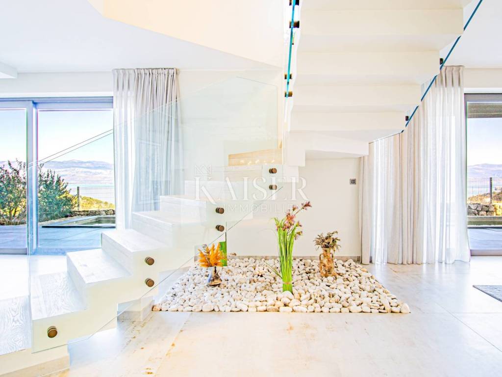 Immerse yourself in luxury and perfection of execution - Kaiser immobilien mediates in the sale of an exclusive villa in Vrbnik, the island of Krk. Vrbnik is undoubtedly one of the most famous Croatian towns, which, like other old castles on the island, is located high up, almost 50 meters high, and in a truly special place on a cliff that literally plunges into the sea. It was first mentioned in 1100. The inhabitants were mostly engaged in agriculture, less in shipping and fishing. Today, the most famous product of the Vrbnik field and Vrbnik in general is the golden yellow wine - Žlahtina; it has become famous in wider Croatia. According to the stories of older locals, before the wine gained fame, cereals were grown in the field to feed families that had more members than today. In such conditions, the vines were grown along the edges of the field because there was no market and the wine was produced only for their own needs. Vrbnik is still, mainly, a picnic spot, which is in some ways an advantage. With its rich history, Vrbnik is called the cradle of literacy among Croats and is certainly one of the oldest places on the island of Krk. Narrow streets prevail in Vrbnik, so it is not surprising that the narrowest street in the world is located right here. With its location and orientation, the villa seems to float above Vrbnik and its panoramic view of the sea and the picturesque thousand-year-old town is breathtaking. Located on a plot of 1,000m2, the total living area of 268m2 is spread over two floors. On the ground floor, next to the entrance area and hallway, there is an open-concept living area with a living room, kitchen and dining room. The living area is completely glazed with panoramic walls and top-quality aluminum joinery. On the ground floor there is also a separate wellness area with a sauna and "starry sky" ceiling lighting, as well as a guest toilet with a laundry room and storage room. The living area leads out onto a covered terrace next to which there is a heated 43m2 swimming pool with a shower and a sunbathing area. Upstairs there are three bedrooms with their own "en suite" bathrooms, all of which have access to a covered terrace with a glass fence. The entire building offers a panoramic view of the sea and the thousand-year-old town located on a cliff above the sea. This indescribable and almost endless view of the sea and Vrbnik, and the abundant presence of sunlight in the building, are greatly contributed to by the panoramic glass walls installed along the entire building, in the full height of the rooms. The covers of lifestyle magazines are guaranteed. Top-quality materials and equipment were used in the furnishing and construction. The building is built with Porotherm blocks, the STO facade system with 10cm of insulation was used. The flat roof has 20cm of thermal insulation, a TPO membrane in combination with the FIRESTONE system protects against moisture, and the roof windows are VELUX. Top-quality Italian ceramics from the manufacturer FLAVIKER, massive aluminum joinery from the manufacturer HEROAL in combination with LAMISTAL glass, and an entrance door with a triple lock and fingerprint unlocking from the manufacturer INOTHERM. VIESMANN heating, air conditioning and ventilation system. There is also a summer kitchen in the garden, and there is enough space in the driveway to park several vehicles. ID CODE 105-212 The agency commission for the buyer is 3% + VAT and is paid in the case of purchasing a property, upon conclusion of the first legal act.
