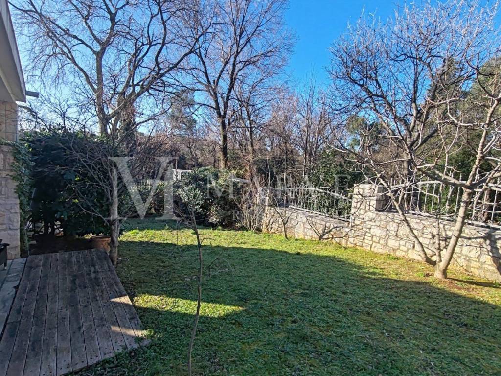 The fully landscaped and fenced garden ensures complete privacy. It features Mediterranean vegetation, a summer kitchen, and an outdoor shower. The garden also provides enough space for multiple parking spots, and the house is accessible via a paved road.