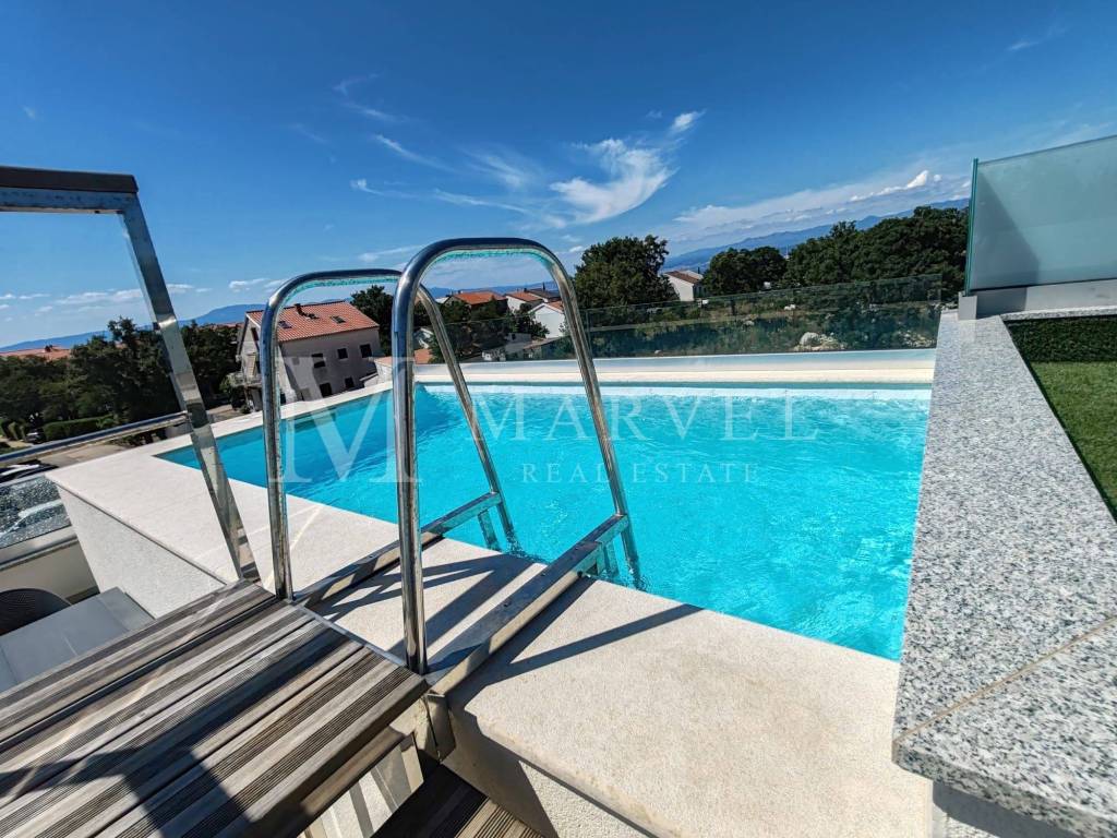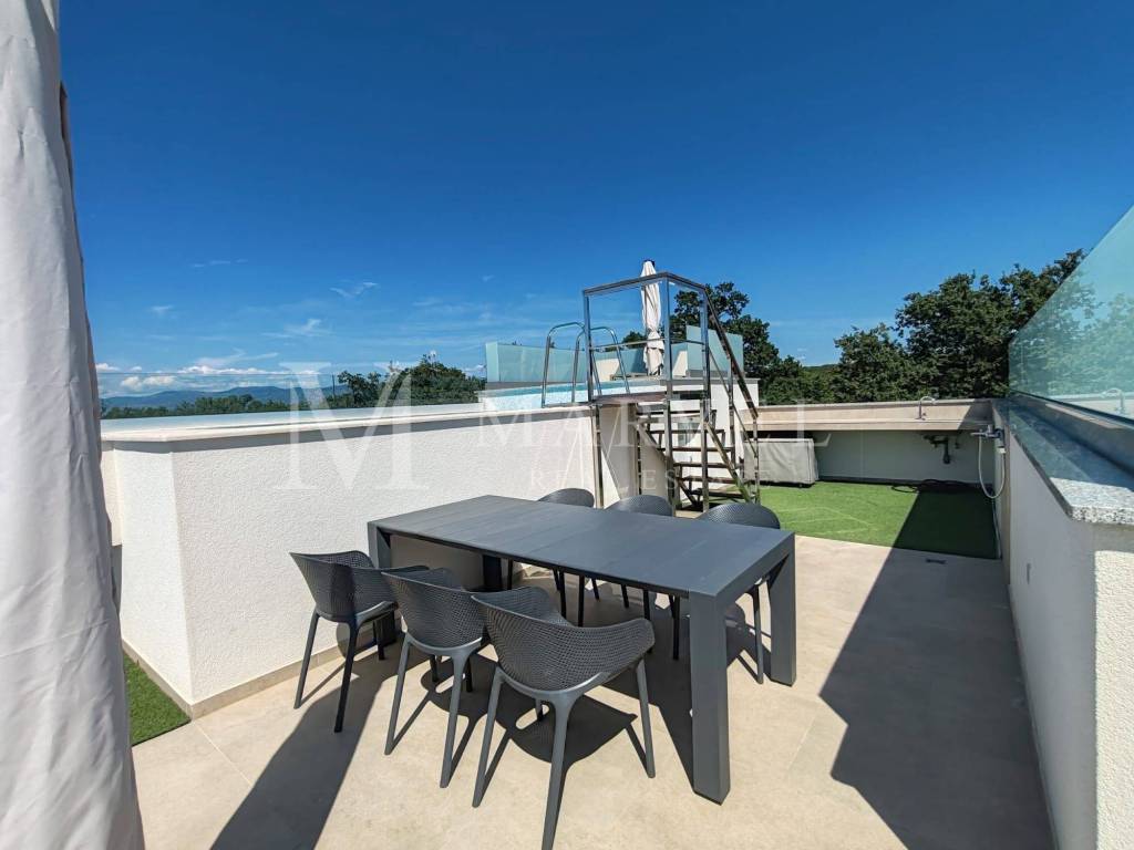 We are selling a furnished apartment in the quiet area of Njivice on Krk Island, featuring a roof terrace and pool. The apartment has a total area of 123 m2 and consists of two floors and a roof terrace.