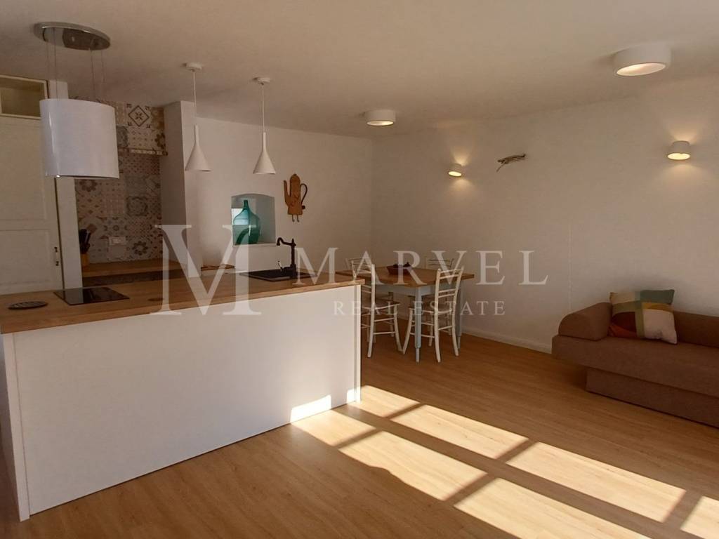 The ground floor has been fully renovated and equipped, featuring a spacious living room with a kitchen, a bedroom, and a modern bathroom. The first floor is under renovation, with plans for two bedrooms and two bathrooms, offering flexibility for customization.