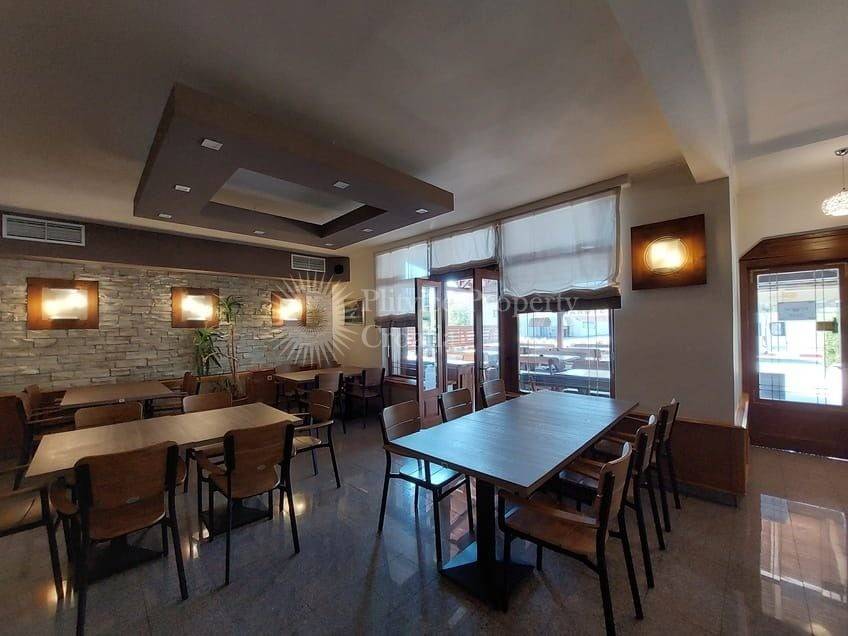 The restaurant is in use and contains 2 halls, a buffet arrangement, a large covered terrace, a bar, and male and female toilet units. One hall doubles as a conference hall and can be partitioned from the other. In the back of the restaurant is a spacious professional kitchen. On the cellar floor are garages, cooling rooms and several central heating systems (pellets, wood and oil).