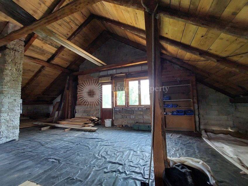 The property contains a house with two floors and an attic, a back garden with trees, a shed with wood storage, and a room with a central heater and an electric boiler.