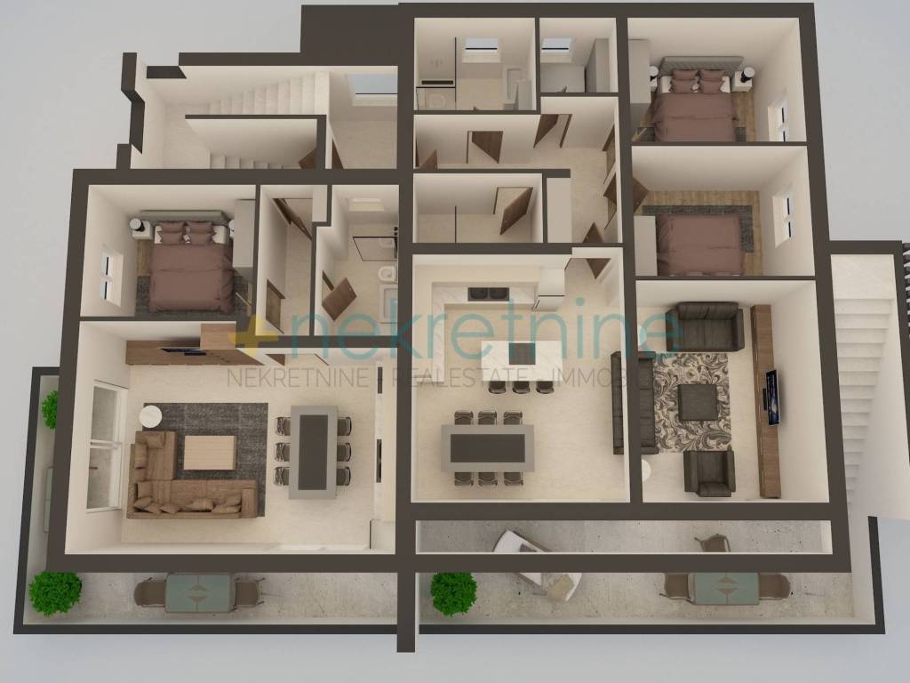 Stan se sastoji od dnevnog boravka povezanog s kuhinjom, dvije spavaće sobe, dvije kupaonice, spremista, balkona (29,68m2), te uključuje jedno parkirno mjesto bez dodatnih troškova.
