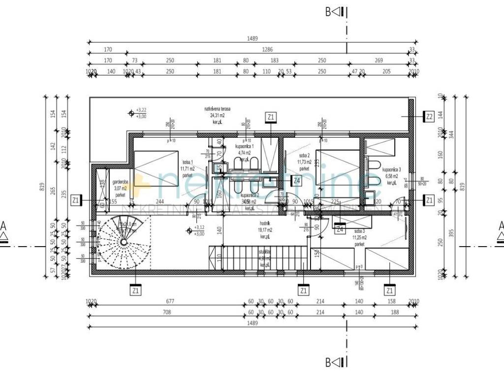 Prvi kat (89,92 m): tri prostrane spavaće sobe, svaka s vlastitom kupaonicom, uključujući i glavnu spavaću sobu s garderobom, te natkrivena terasa (NKP 12,16 m).