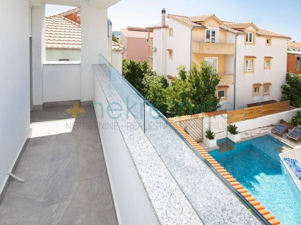 Zgrada je novija, s modernom fasadom koja spaja staklene površine, beton i prirodne materijale. S čistim linijama i velikim prozorima, zgrada omogućuje maksimalnu količinu prirodnog svjetla. Smještena je u mirnom dijelu grada, u blizini plaže i centra, s atraktivnim pogledima i blizinom svih važnih sadržaja.