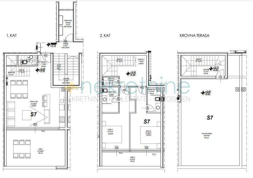 Prodaje se prostrani dvosoban stan (S7) na tri etaze u Privlaci, u neposrednoj blizini Zadra. Ukupna površina stana s pripadcima iznosi 129,99 m.