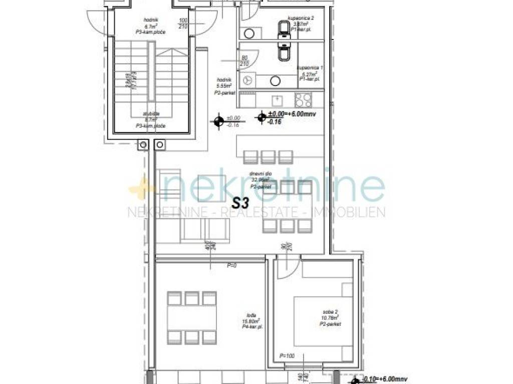 Prodaje se prostrani dvosobni stan (S3) u prizemlju novogradnje u Privlaci, u neposrednoj blizini Zadra. Ukupna površina stana s pripadcima iznosi 87,86 m.