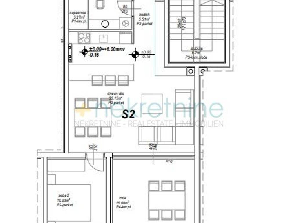 Prodaje se prostrani dvosobni stan (S2) u prizemlju novogradnje u Privlaci, u neposrednoj blizini Zadra. Ukupna površina stana s pripadcima iznosi 88,41 m.