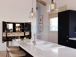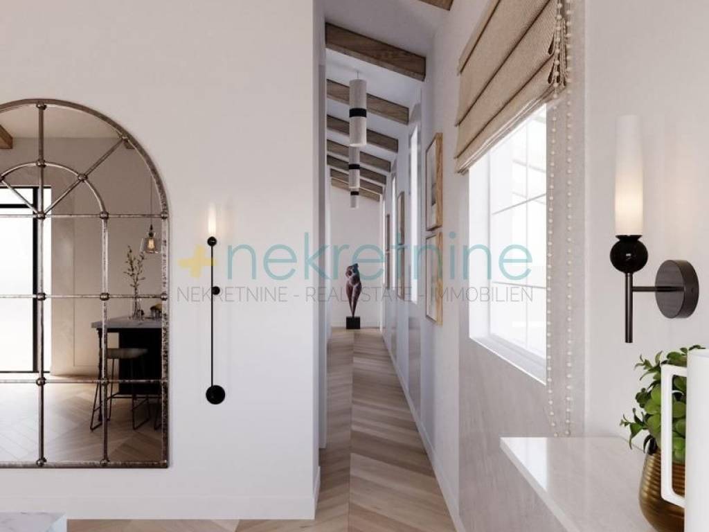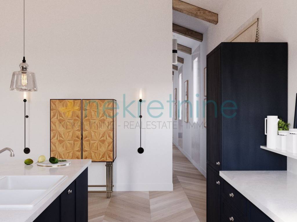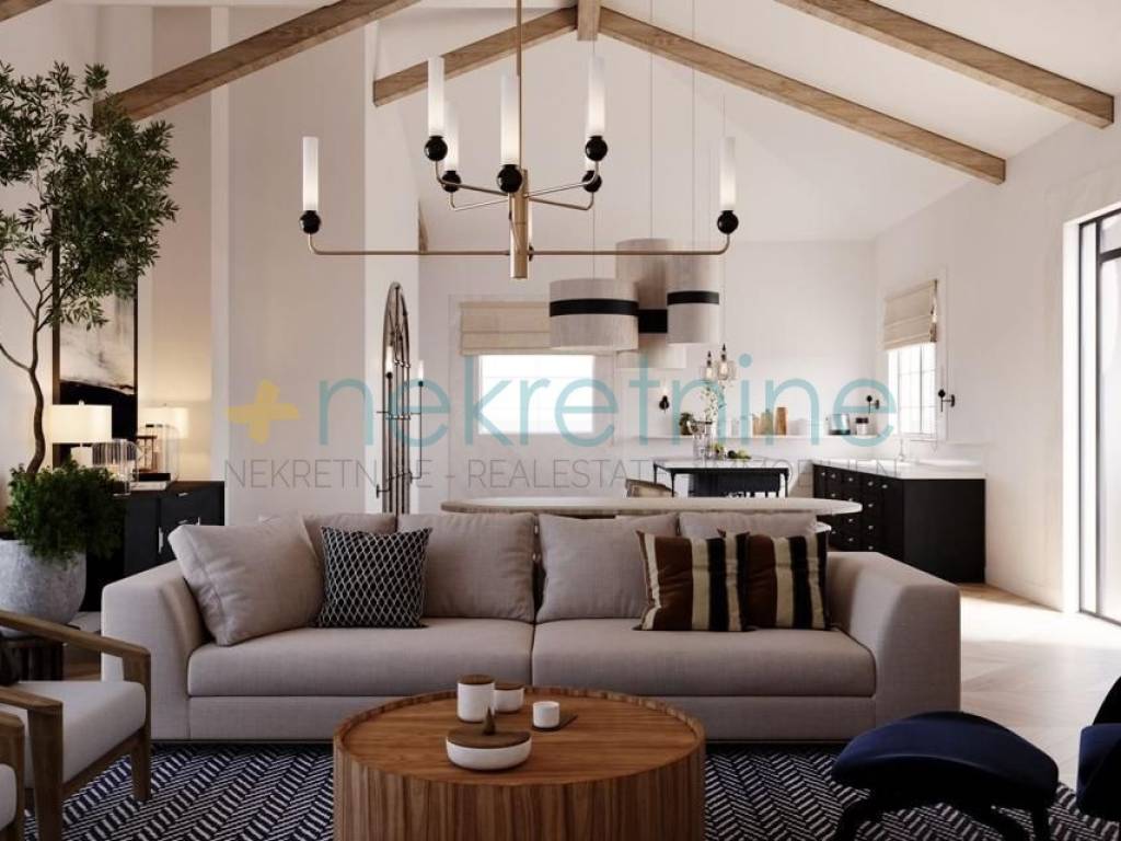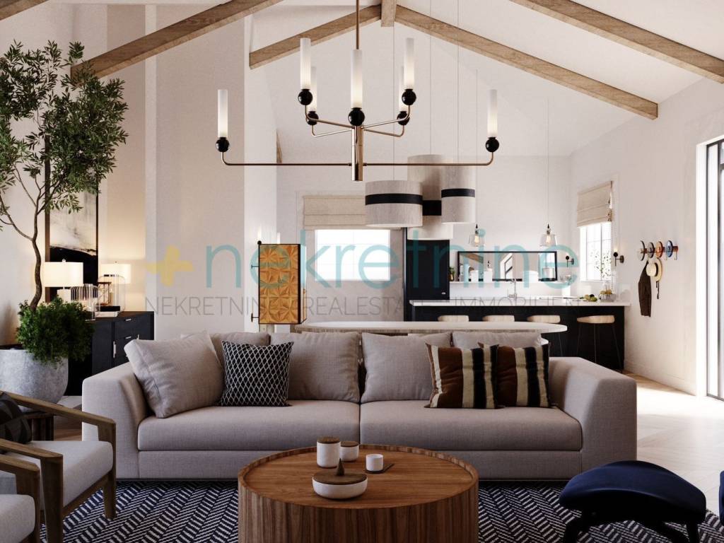 Unutrašnjost kuće krasi visokokvalitetan mediteranski namještaj, dok drvene grede na stropovima daju dodatnu toplinu i eleganciju prostoru.