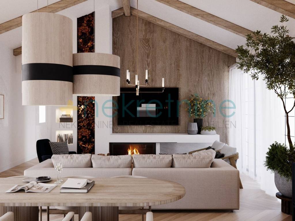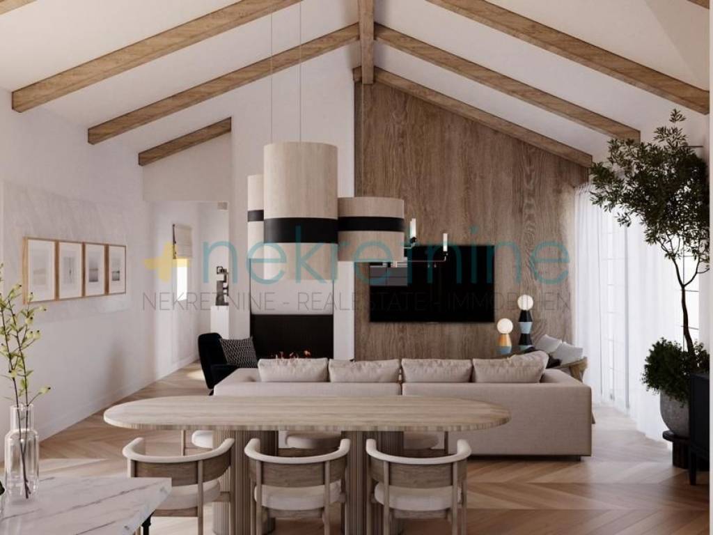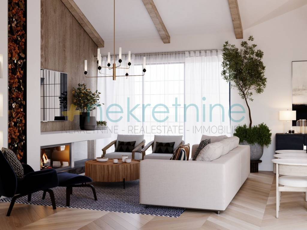 Dnevni boravak elegantan i prozračan, s velikim staklenim stijenama koje omogućuju izlaz na terasu i obiluju prirodnim svjetlom.