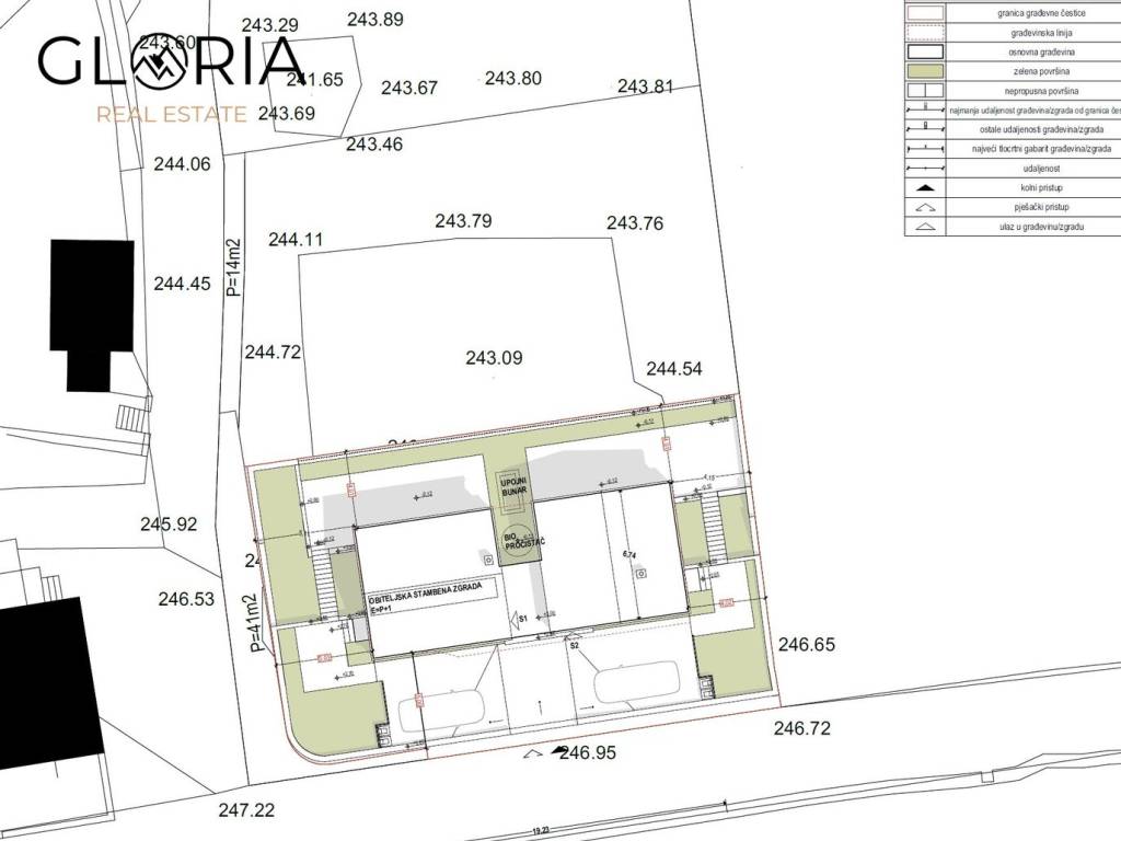 Zemljište se prodaje isključivo sa objektom izgrađenim do faze "visoki roh-bau", a koji objekt će se sastojati od dva dvoetažna stana, svaki površine cca 75 m2.