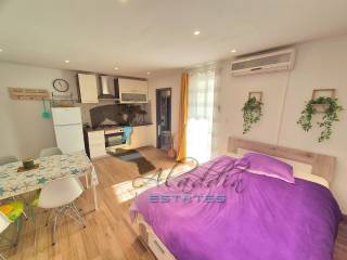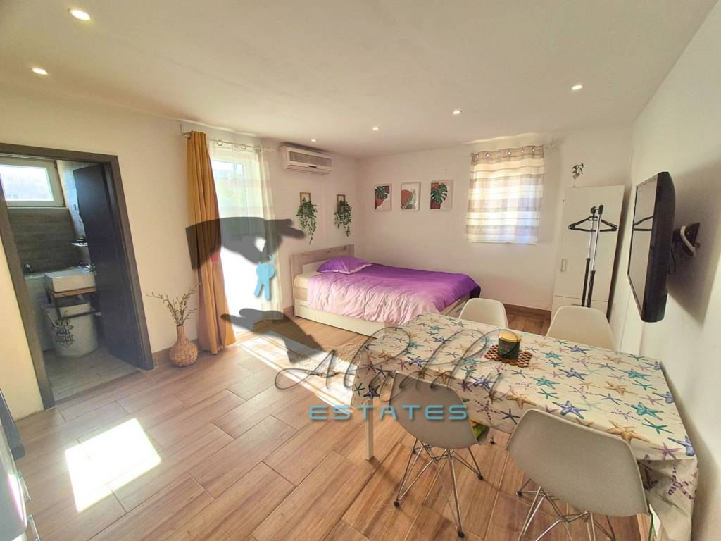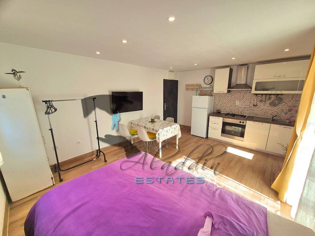 Ceramic tiles are installed throughout the rooms, the joinery is PVC with double-glazed insulated glass and curtains, and there is also a smart TV with a terrestrial antenna. Parking spaces next to the building are not individually owned but left for residents to use. The studio apartment has a separate electricity meter, while the water meter is shared with a flat annual fee of only 50 euros, plus 5 euros annually for electricity costs for the staircase. The studio apartment overlooks the quiet side opposite the main road and is characterized by a high level of privacy and tranquility. The building is currently being connected to the sewage network.