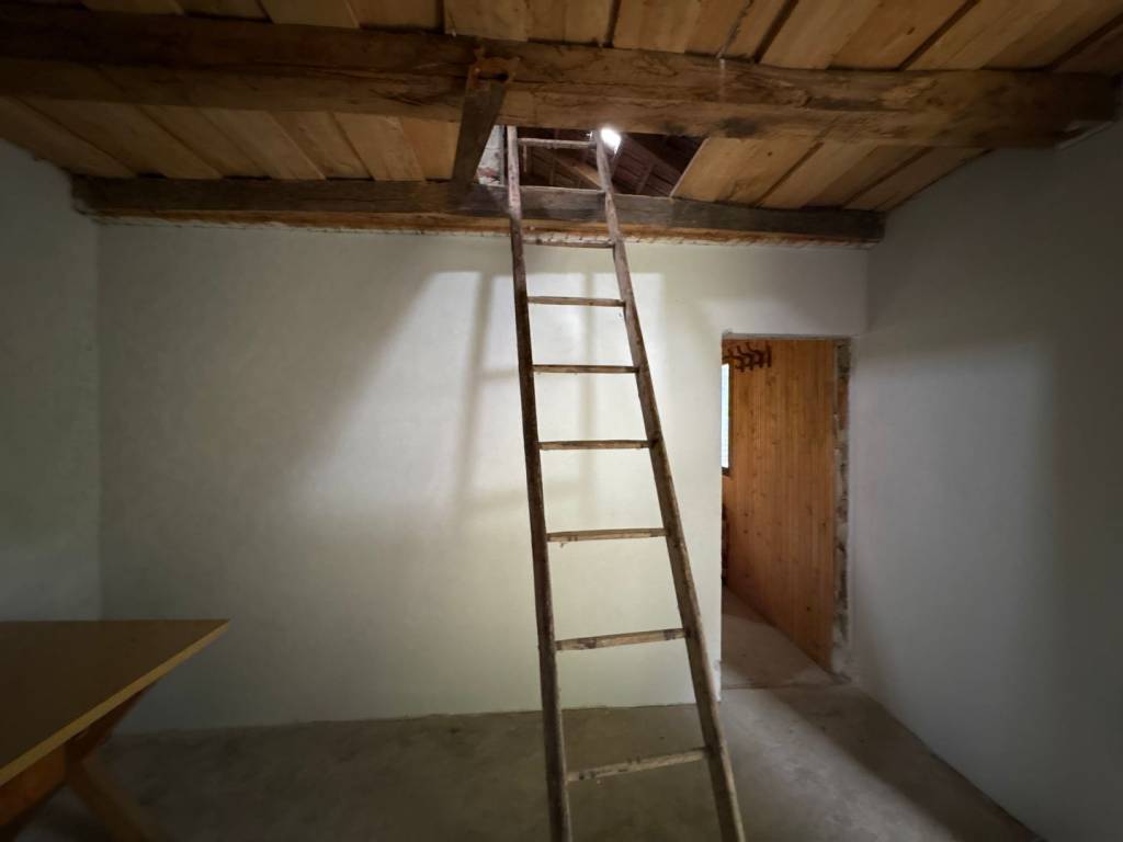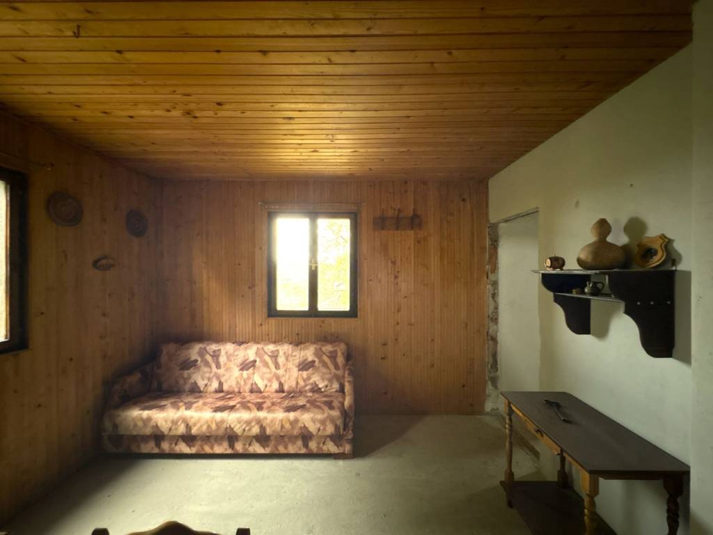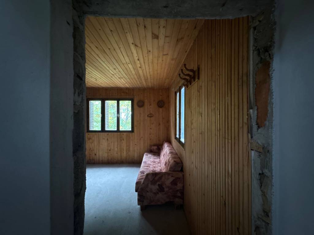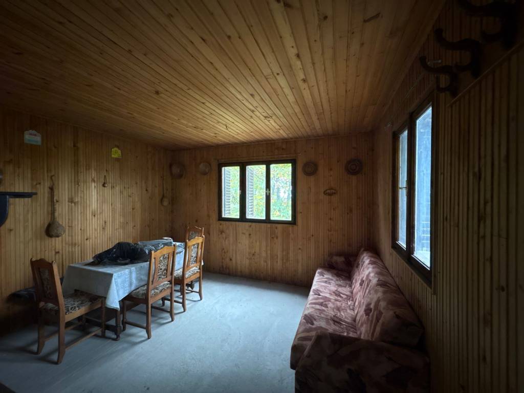 The ground floor has a rectangular shape (7.20 x 4.40 m²) with a covered entrance, and inside there are two rooms. One of them contains stairs leading to the attic space, which can be used for additional storage or drying cured meat products. The other room is arranged as a social area and includes a table, chairs, a bench, and a two-seater couch, suitable for gatherings with friends and family. The weekend cottage has a balcony, and the joinery is wooden.