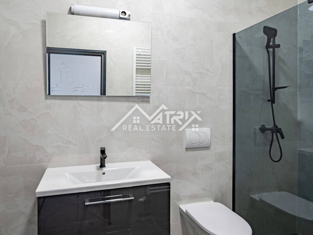 The space is stylishly finished with high-quality materials. A sleek bathroom with a walk-in shower, ceramic tiles, and modern sanitary fittings offer a sense of luxury and practicality. Living areas feature new flooring, and heating is provided by radiators and an air conditioning unit, ensuring year-round comfort.
