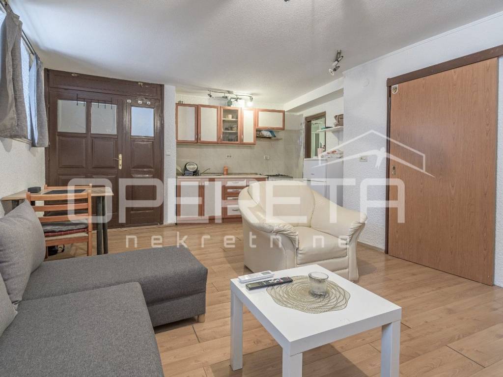 It consists of a living room with a kitchen and dining area, one bedroom, and a bathroom. The apartment is fully furnished and ready for immediate move-in.