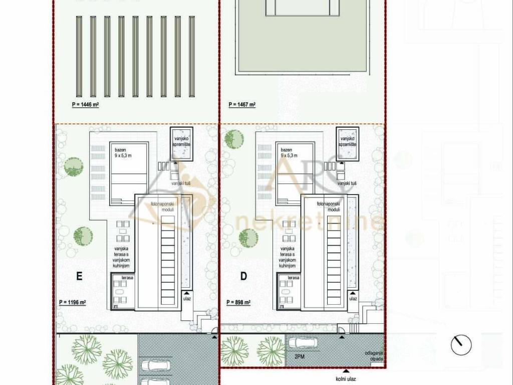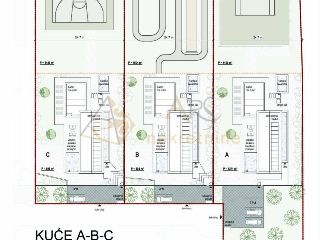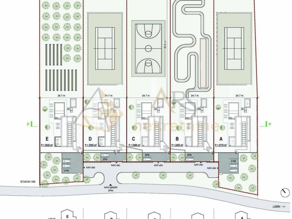 The house plots range from 896 to 1.270 m. Each house on the north side has an additional area of 24.7 m wide and about 60 m long, perfect for arranging sports fields, playgrounds, or gardens according to the owner's wishes. The houses are marked as A, B, C, D, and E, with the difference that in houses D and E one room has access to a 17 m roof terrace.
