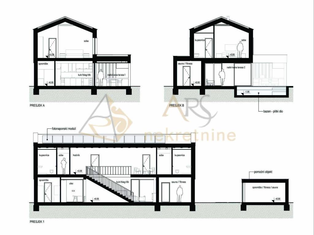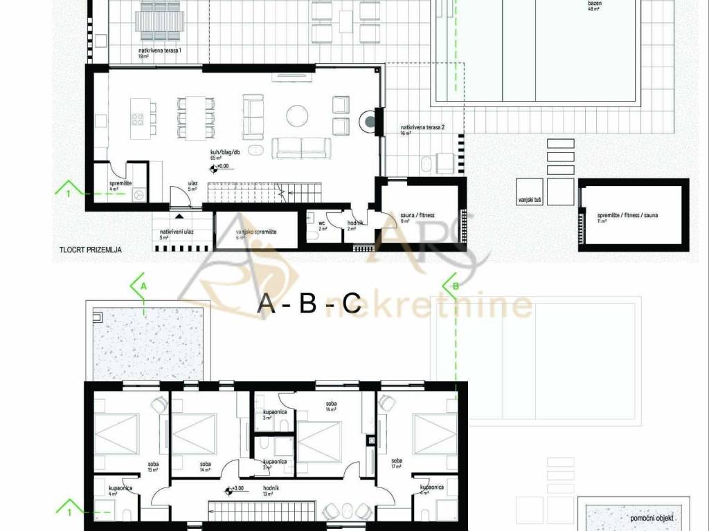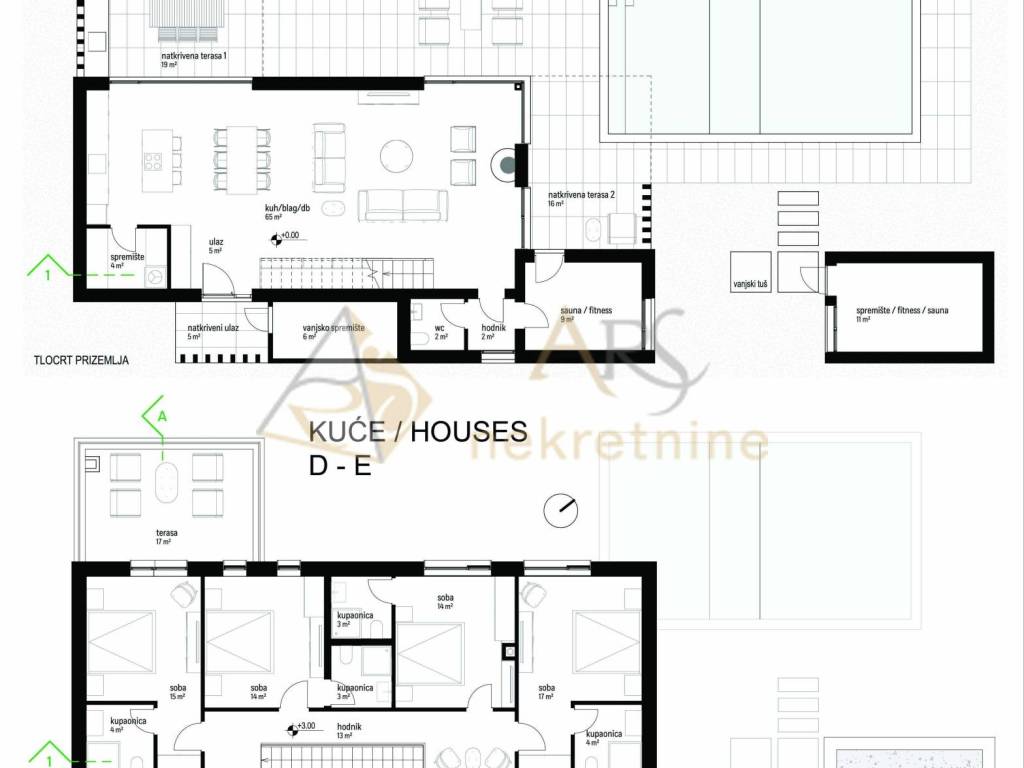 Besides the covered terraces and storage rooms, each house has a swimming pool with a total water area of 48 m, divided into a shallow children's area and a deeper part.