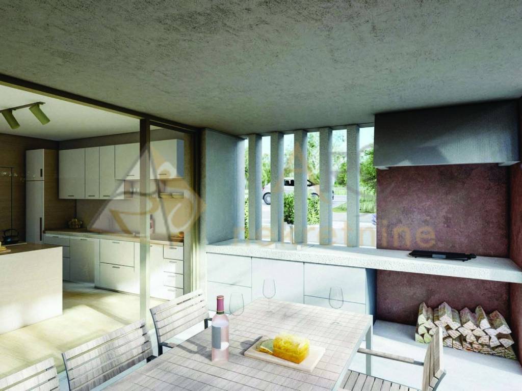The outdoor terrace includes a covered outdoor kitchen, paved with prefabricated concrete slabs and an outdoor shower.