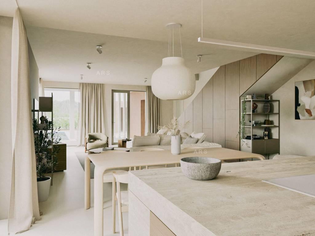 On the ground floor, there is a spacious open-plan living room with a kitchen and dining area, which open onto two covered outdoor terraces. Next to the kitchen is a storage room in a separate area.