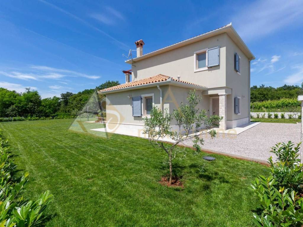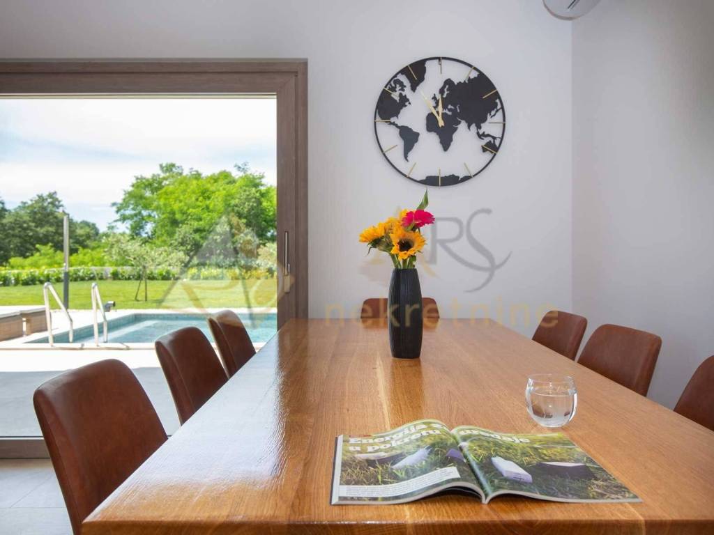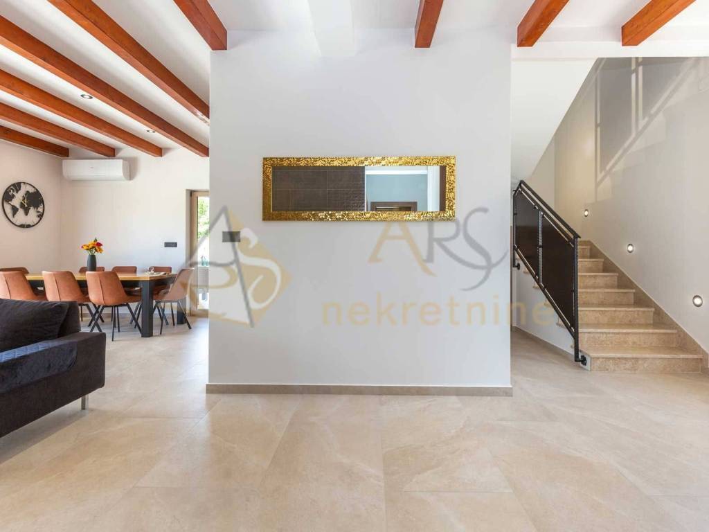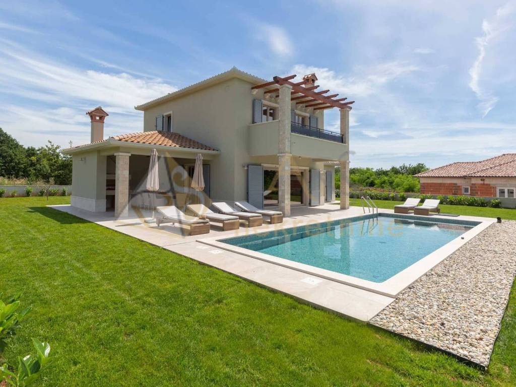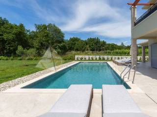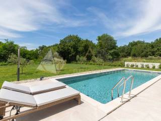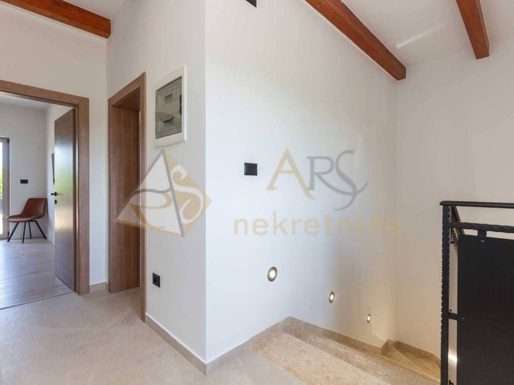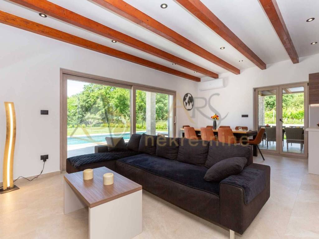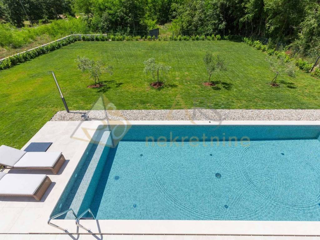 Experience peace and comfort in this wonderful newly built house located in a quiet neighborhood with lots of greenery, just a few minutes' drive from Labin. The town is 5 km away, and the first large store is less than 3 km away. Tourist resort Rabac and its beautiful pebble beaches is 10 km far. This two-story house offers you a spacious and bright interior. From the kitchen and dining room there is access to a covered terrace with an outdoor fireplace, ideal for barbecuing and socializing. On the ground floor there is a bedroom and a bathroom. From the living room you can enjoy the view of the large pool measuring 4 x 10 m, which will provide you with refreshment and entertainment during hot summer days. There is a spacious sunbathing area around the pool. Upstairs there are two more bedrooms, each with its own bathroom and access to a covered terrace with a beautiful view of the surroundings. Each room in the house has air conditioning for a comfortable temperature throughout the year. The house also has a chimney and preparation for floor heating and pool heating - a heat pump is required. There is a boiler in the external storage room that can be connected to solar collectors if you want to install them and use renewable energy sources. The house is sold fully furnished. The house also has an irrigation system for maintaining greenery in the garden. This house is perfect for those looking for privacy and comfort in a beautiful natural environment.