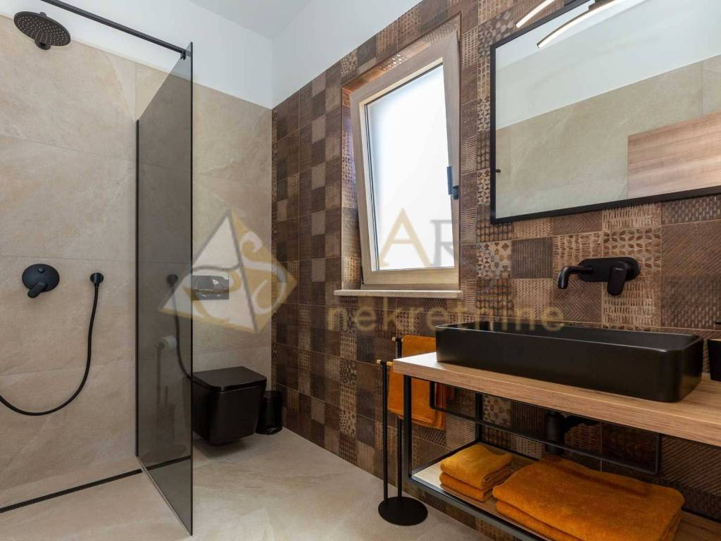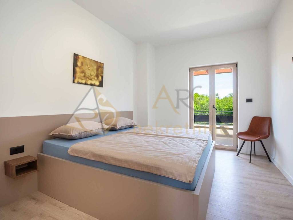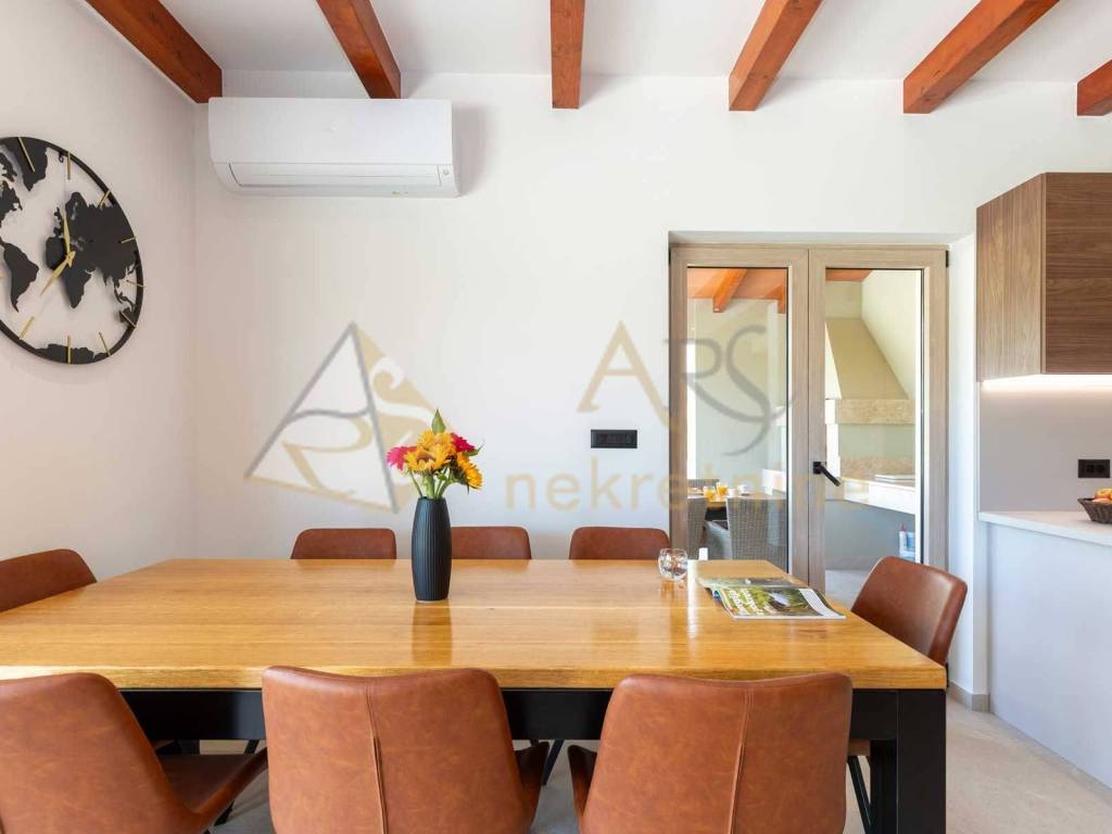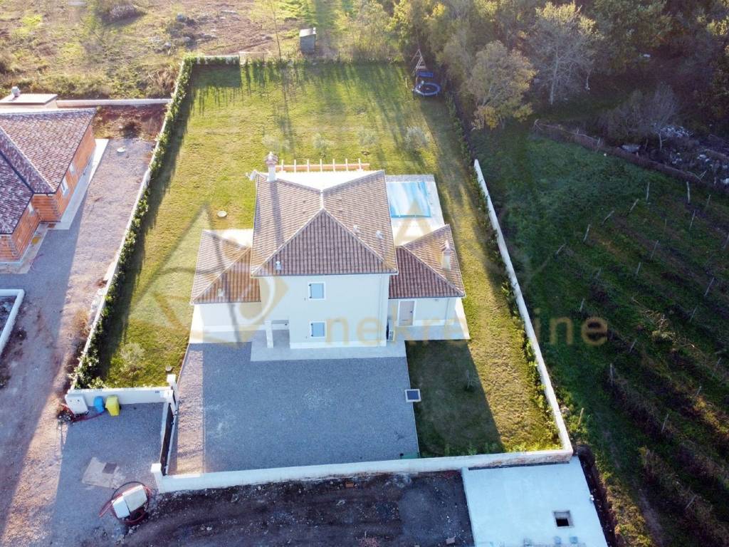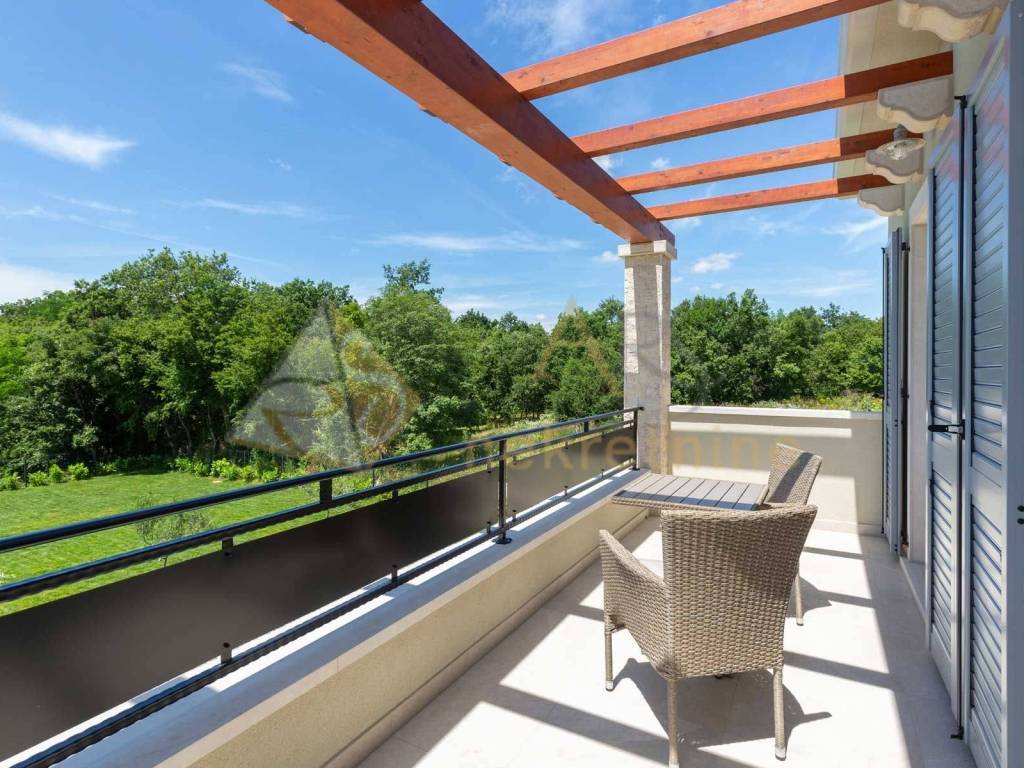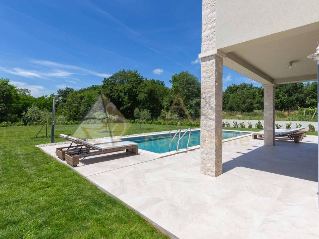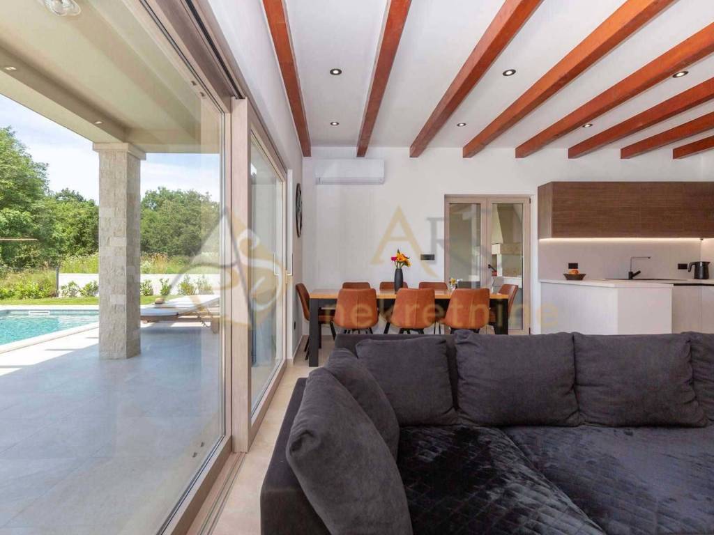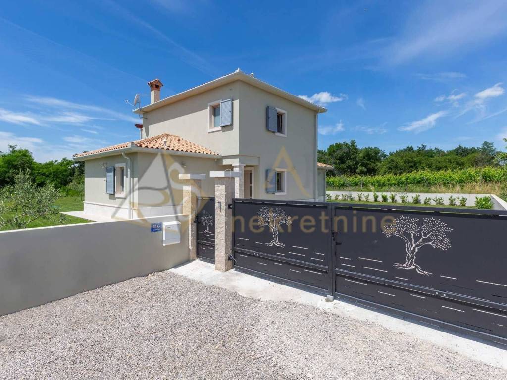 Experience peace and comfort in this wonderful newly built house located in a quiet neighborhood with lots of greenery, just a few minutes' drive from Labin. The town is 5 km away, and the first large store is less than 3 km away. Tourist resort Rabac and its beautiful pebble beaches is 10 km far. This two-story house offers you a spacious and bright interior. From the kitchen and dining room there is access to a covered terrace with an outdoor fireplace, ideal for barbecuing and socializing. On the ground floor there is a bedroom and a bathroom. From the living room you can enjoy the view of the large pool measuring 4 x 10 m, which will provide you with refreshment and entertainment during hot summer days. There is a spacious sunbathing area around the pool. Upstairs there are two more bedrooms, each with its own bathroom and access to a covered terrace with a beautiful view of the surroundings. Each room in the house has air conditioning for a comfortable temperature throughout the year. The house also has a chimney and preparation for floor heating and pool heating - a heat pump is required. There is a boiler in the external storage room that can be connected to solar collectors if you want to install them and use renewable energy sources. The house is sold fully furnished. The house also has an irrigation system for maintaining greenery in the garden. This house is perfect for those looking for privacy and comfort in a beautiful natural environment.