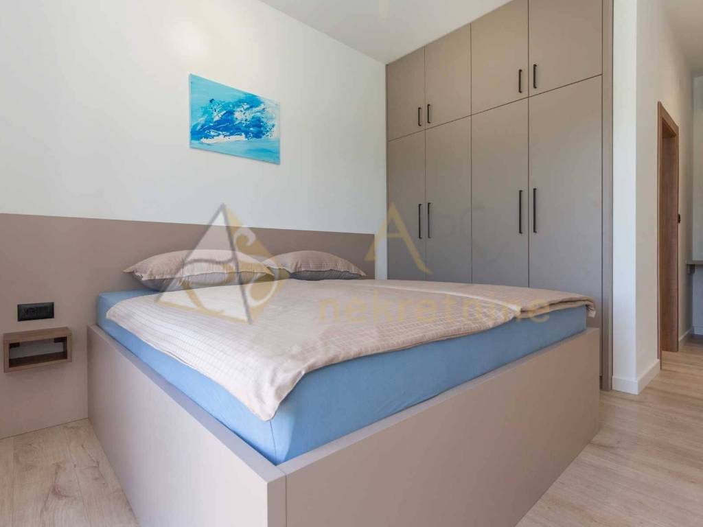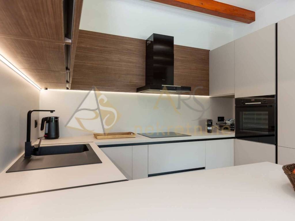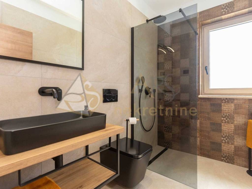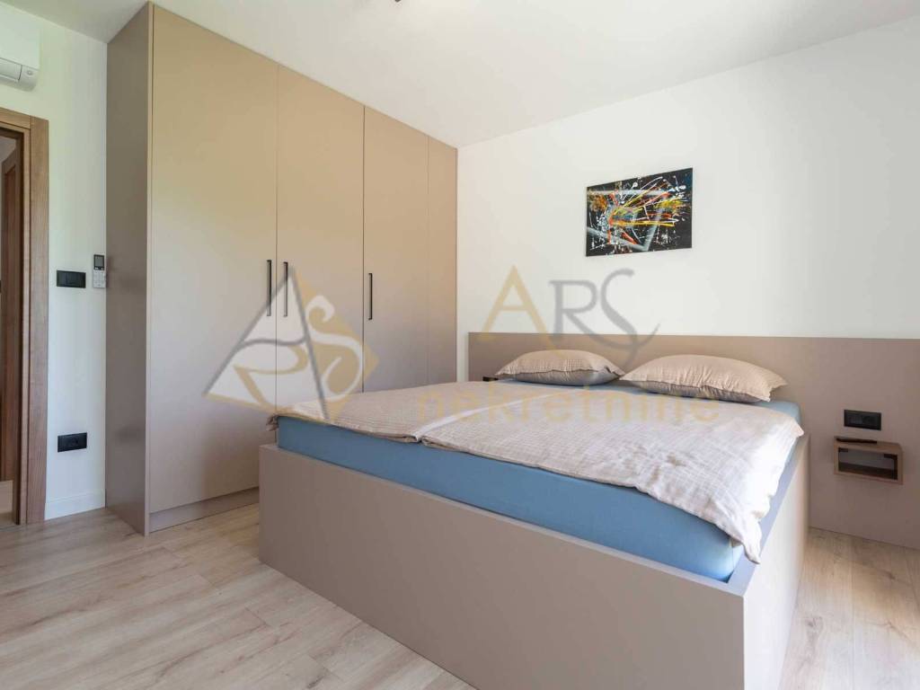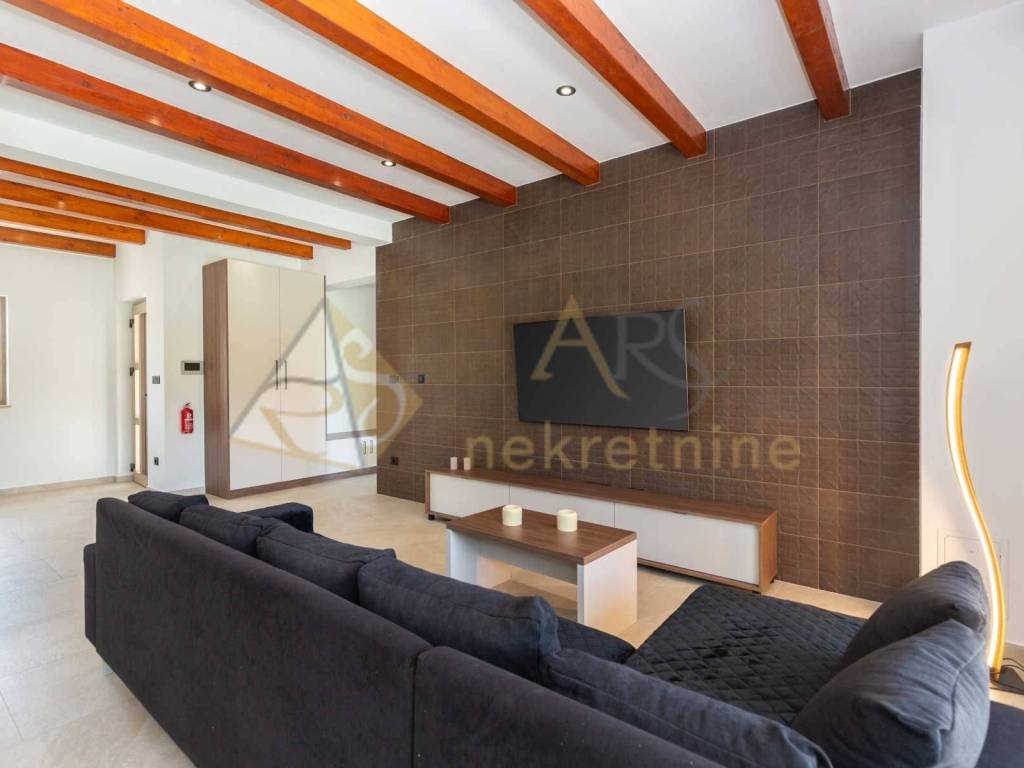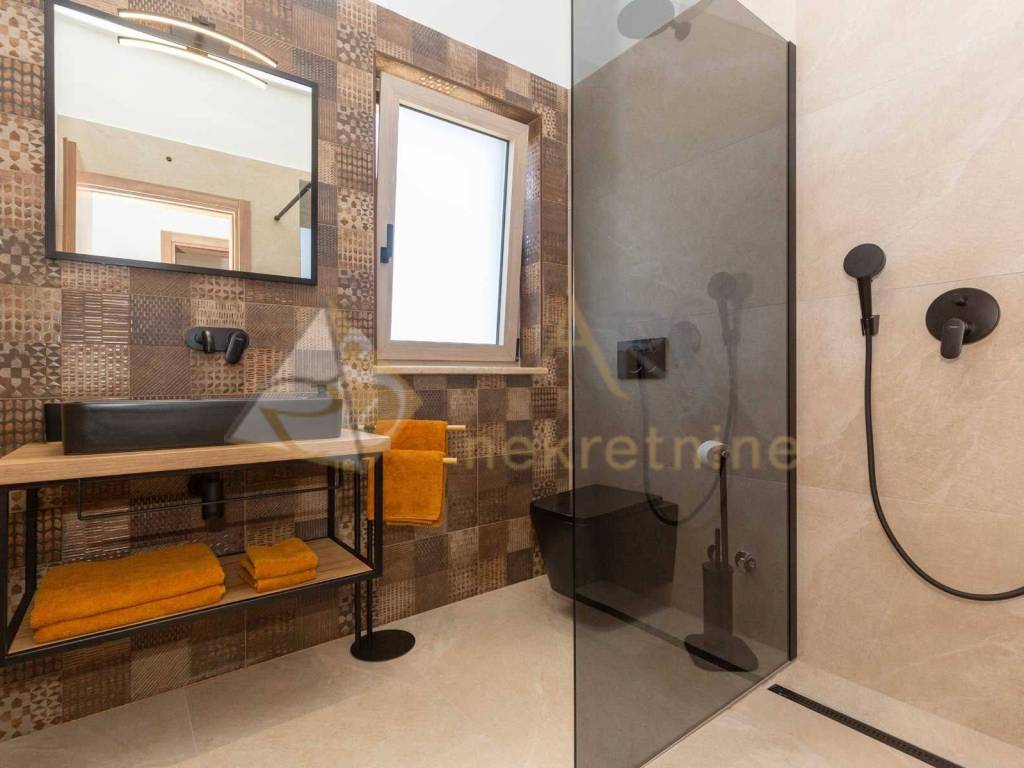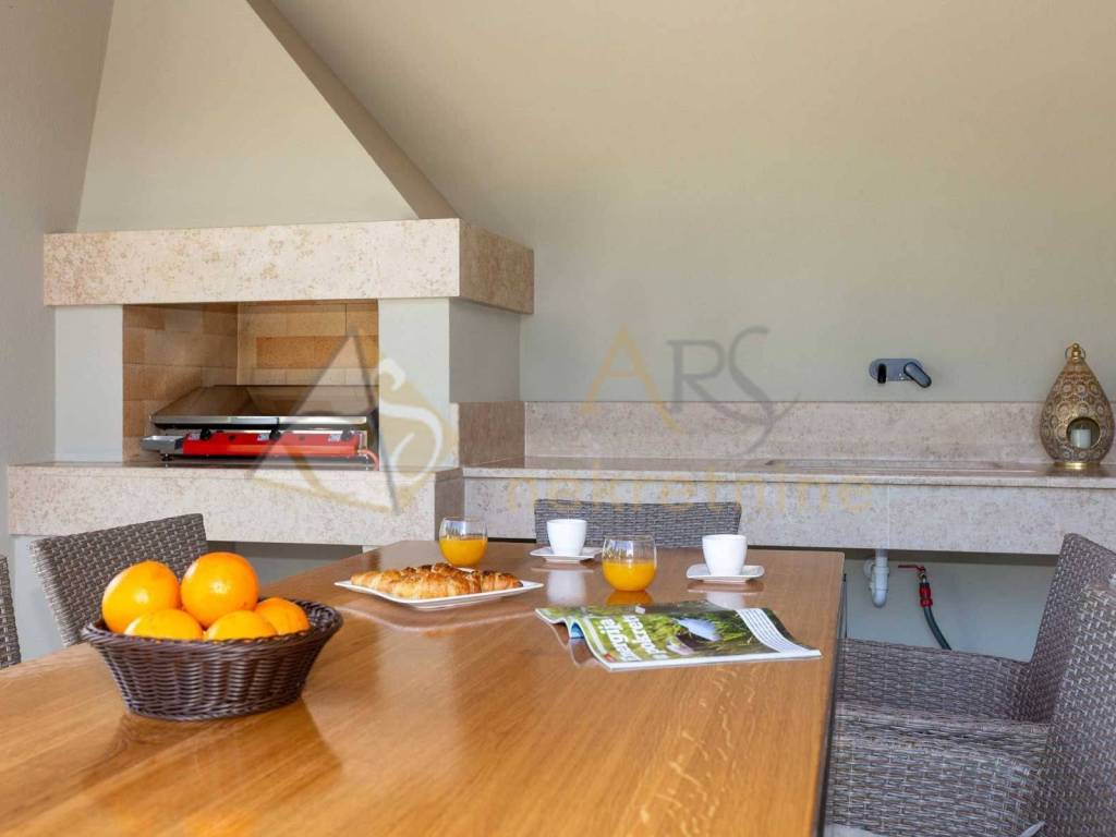 Experience peace and comfort in this wonderful newly built house located in a quiet neighborhood with lots of greenery, just a few minutes' drive from Labin. The town is 5 km away, and the first large store is less than 3 km away. Tourist resort Rabac and its beautiful pebble beaches is 10 km far. This two-story house offers you a spacious and bright interior. From the kitchen and dining room there is access to a covered terrace with an outdoor fireplace, ideal for barbecuing and socializing. On the ground floor there is a bedroom and a bathroom. From the living room you can enjoy the view of the large pool measuring 4 x 10 m, which will provide you with refreshment and entertainment during hot summer days. There is a spacious sunbathing area around the pool. Upstairs there are two more bedrooms, each with its own bathroom and access to a covered terrace with a beautiful view of the surroundings. Each room in the house has air conditioning for a comfortable temperature throughout the year. The house also has a chimney and preparation for floor heating and pool heating - a heat pump is required. There is a boiler in the external storage room that can be connected to solar collectors if you want to install them and use renewable energy sources. The house is sold fully furnished. The house also has an irrigation system for maintaining greenery in the garden. This house is perfect for those looking for privacy and comfort in a beautiful natural environment.