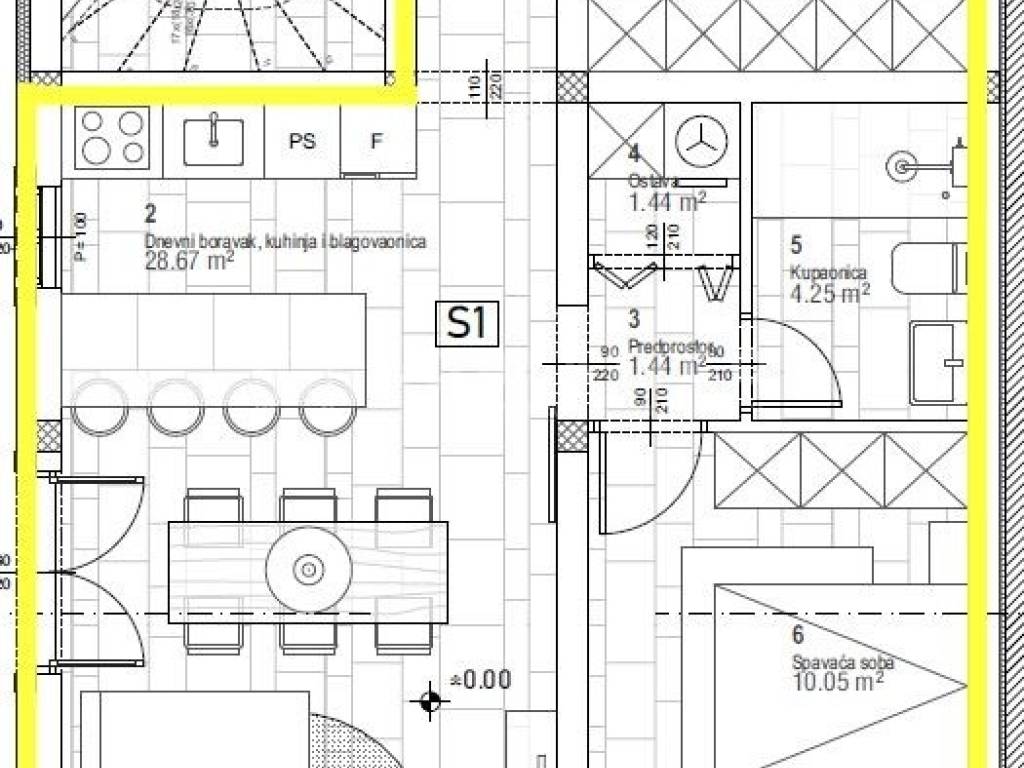 The apartment is located on the ground floor and consists of two bedrooms, a bathroom, a living room, a kitchen with dining area, and a storage room. From the living room, there is access to a terrace that continues into a 25 m garden.