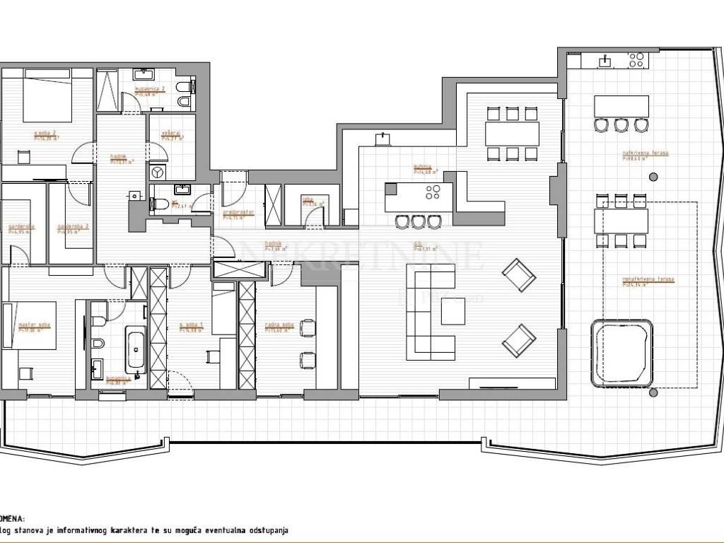 PENTHOUSE onake PH1-10-B2 ukupne netto površine 240,63m u objektu B2 - deseti kat, a sastoji se od predprostora, 2 hodnika, izbe, dnevnog boravka i kuhinje, 3 spavaće sobe, 1 radne sobe, 2 kupaonice, 2 garderobe, vešeraja, WC-a, natkrivene i nenatkrivene terase.
