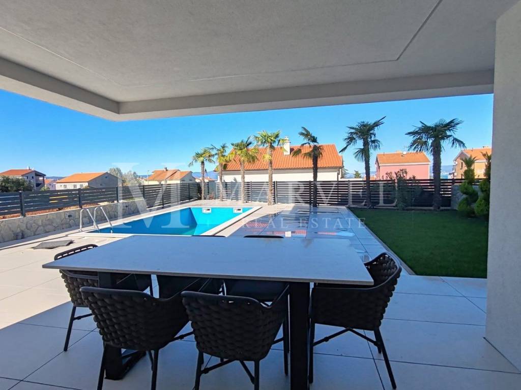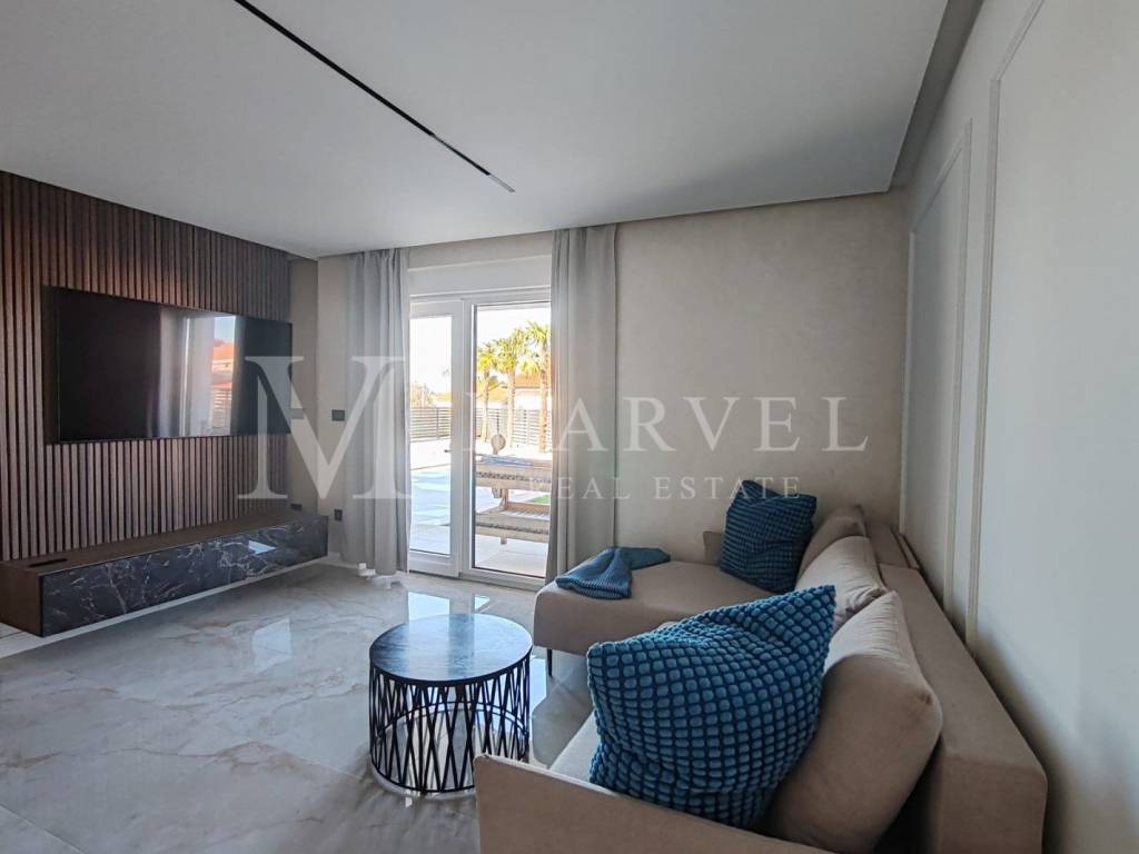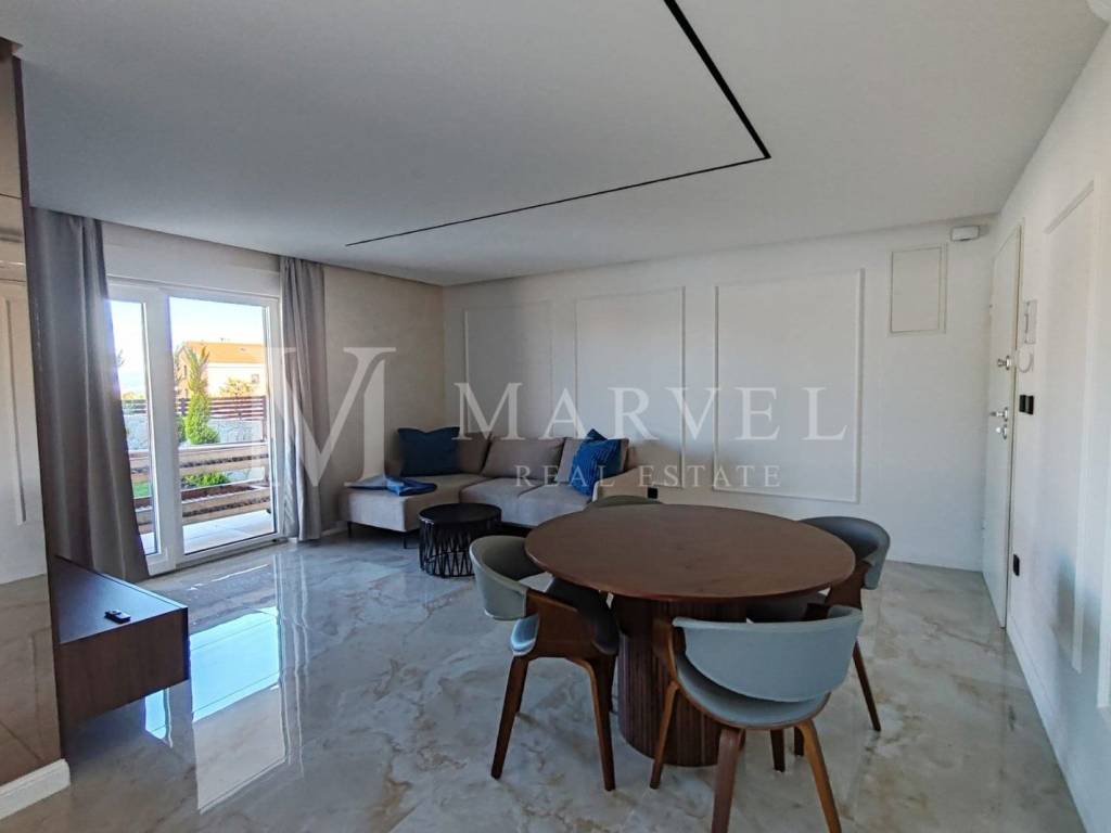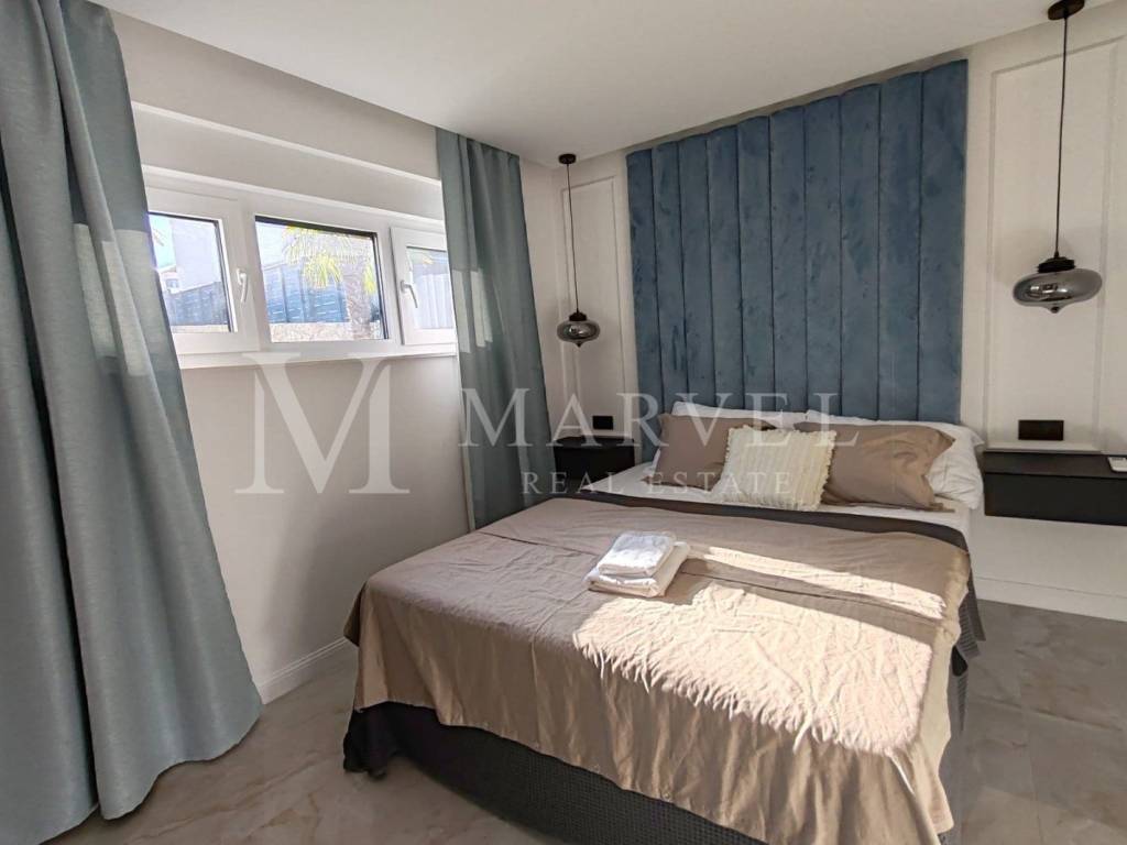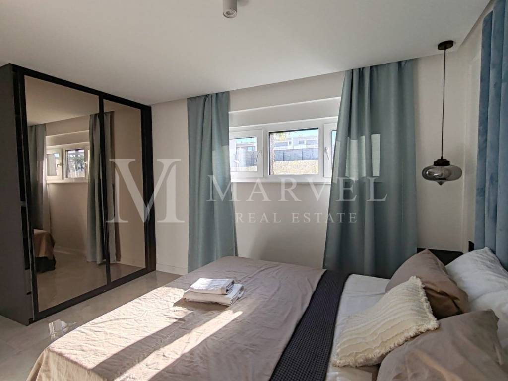 For sale is a modern apartment located on the ground floor of a new building in Malinska, on the island of Krk. The apartment, with a living area of 71 m, stands out with its top-quality design and a spacious 300 m garden featuring a 28 m swimming pool. The garden is partly paved, partly covered with grass, and completely fenced, ensuring privacy and comfort.
