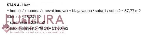 Sastoji se od: dvije spavaće sobe, dnevnog boravka + kuhinja + blagovaona, hodnika, kupaonice i terase.